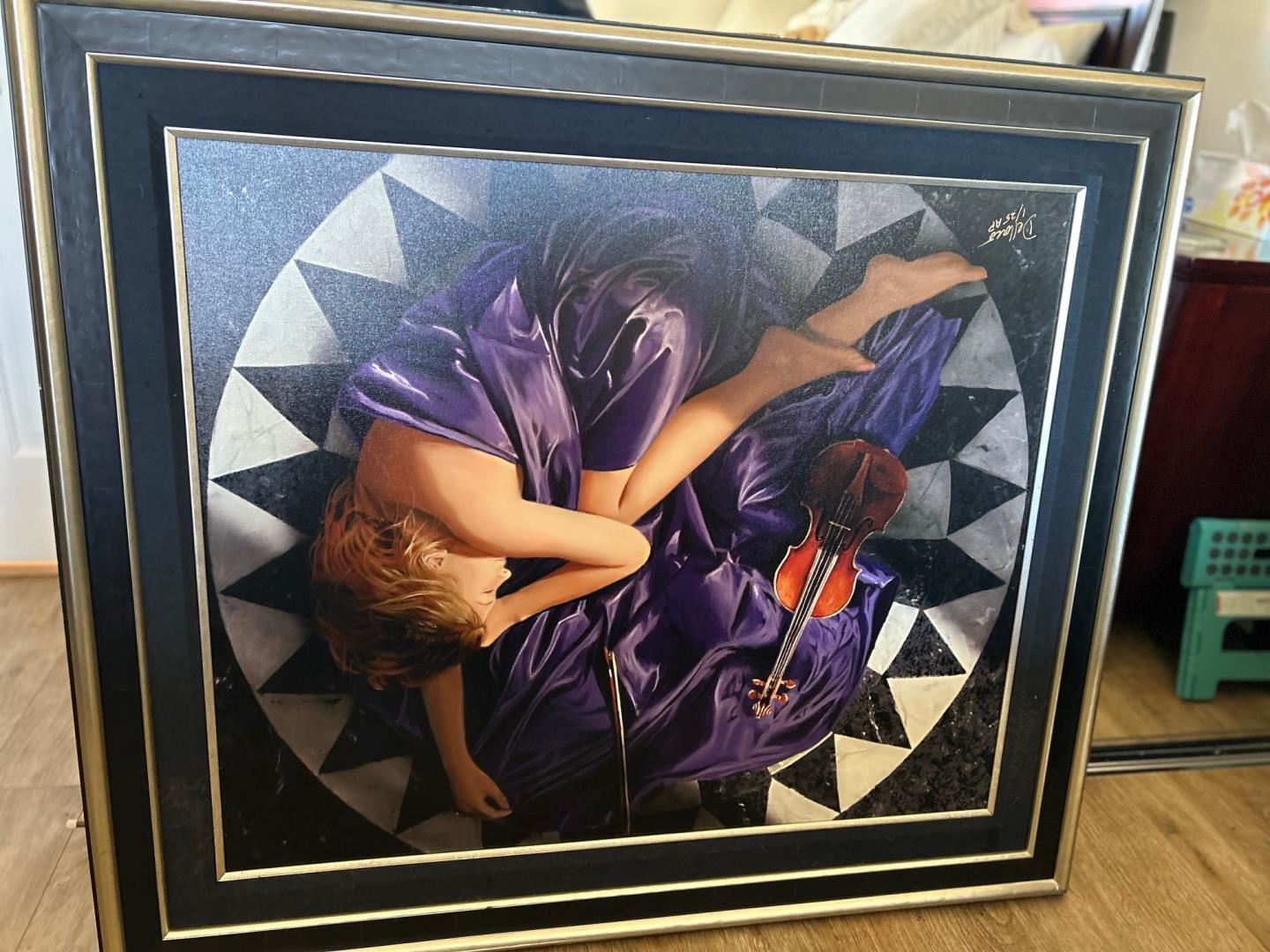 A beautiful modernist image of a violinist exhausted after rehearsal. DELLORCO signed this 30x36" giclee on canvas beautifully framed to 44.75x38.75"