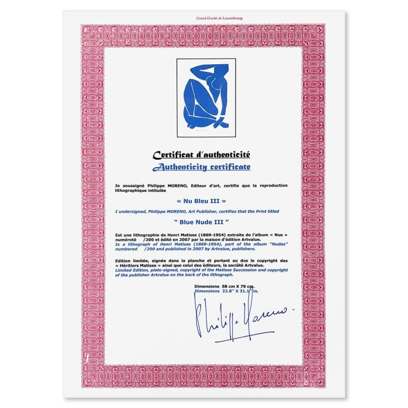 "Nu Bleu III" is a limited edition lithograph by Henri Matisse (1869-1954) bearing the plate signature of the artist. This piece comes from an edition of 200 authorized by the Matisse Estate, but the pieces in this edition are not individually numbered. This piece comes custom framed. Includes Certificate of Authenticity. Measures approx. 28.5" x 37" (frame), 22.5" x 31" (image).