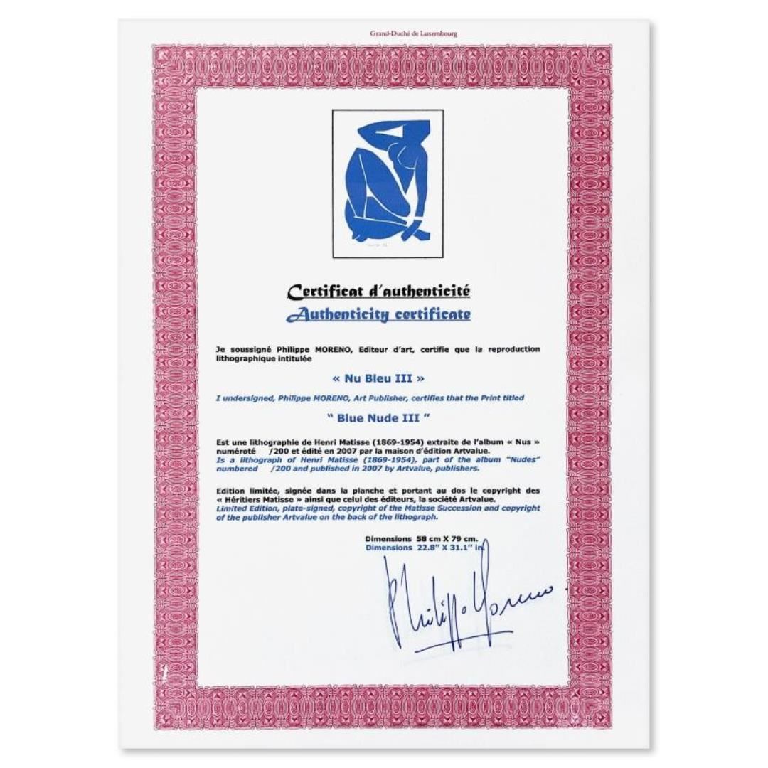 "Nu Bleu III" is a limited edition lithograph by Henri Matisse (1869-1954) bearing the plate signature of the artist. This piece comes from an edition of 200 authorized by the Matisse Estate; the edition number is not on the piece itself but on the certificate. Includes Certificate of Authenticity. Measures approx. 22.5" x 31" (image).