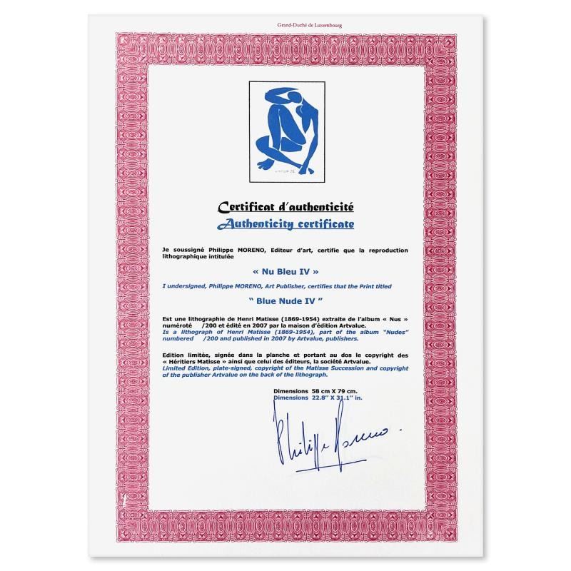 "Nu Bleu IV" is a limited edition lithograph by Henri Matisse (1869-1954) bearing the plate signature of the artist. This piece comes from an edition of 200 authorized by the Matisse Estate; the edition number is not on the piece itself but on the certificate. This piece comes custom framed. Includes Certificate of Authenticity. Measures approx. 28.5" x 37" (frame), 22.5" x 31" (image).