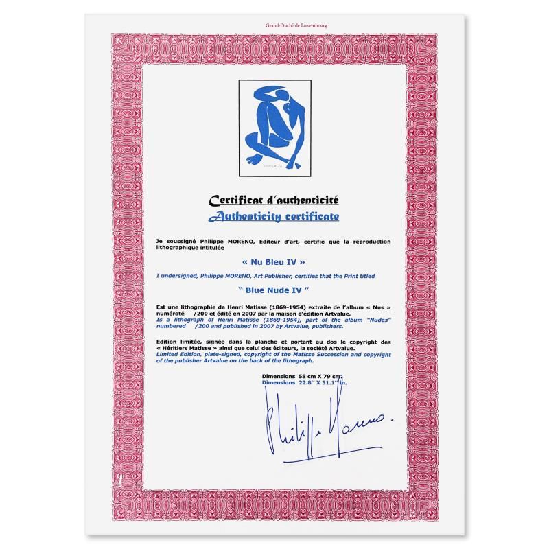"Nu Bleu IV" is a limited edition lithograph by Henri Matisse (1869-1954) bearing the plate signature of the artist. This piece comes from an edition of 200 authorized by the Matisse Estate; the edition number is not on the piece itself but on the certificate. This piece comes custom framed. Includes Certificate of Authenticity. Measures approx. 28.5" x 37" (frame), 22.5" x 31" (image).