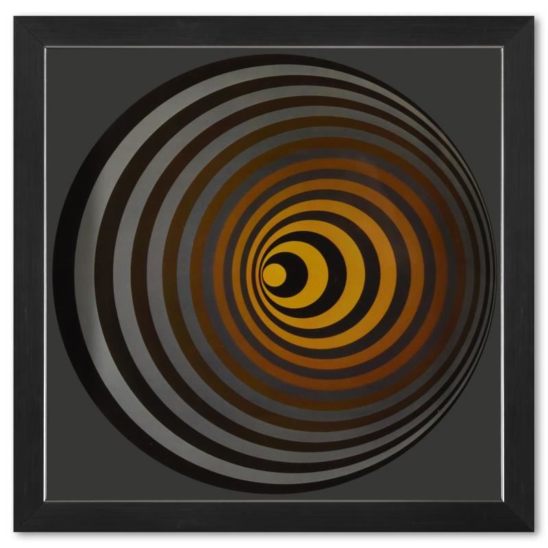 "Oervegn - II et Vonal - Fegn de la serie Vonal (Diptych)" is a set of heliogravure prints on paper, published in 1971, by Victor Vasarely (1908-1997). These pieces come custom framed, with a letter of authenticity and with a 1976 Vasarely paperback. Measures approx. 11.5" x 11.5" (frame), 9" x 9" (image).