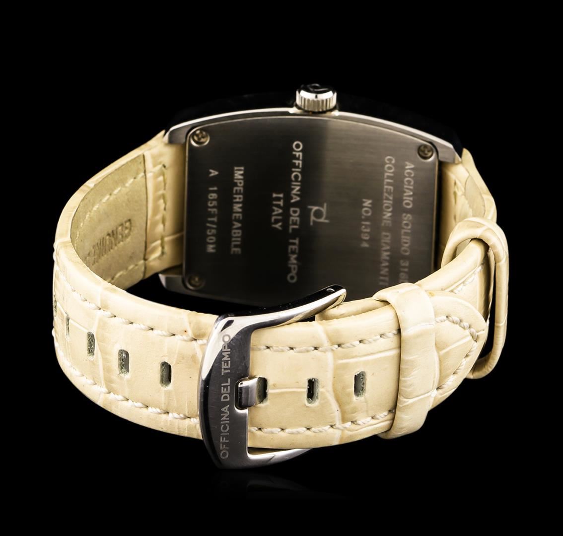 One Italian, Officina Del Tempo Collezione Diamanti Tonneau wristwatch, electronically tested stainless steel, Case: 42mm x 32mm, Water Resistant: 165 feet / 50 meters, Case Back: secured by four set screws, engraved with the manufacturers name, logo, and additional information, Crown: scalloped, with logo, Bezel: diamond set, Crystal: domed anti-reflective synthetic sapphire crystal. Movement: quartz, Officina Del Tempo signed Dial: Cream color, with luminous pointed hands, and numerals, Officina Del Tempo Bracelet: saddle stitched leather strap, eight inch length adjustable. Officina Del Tempo stainless steel buckle. Condition: G-6 Extra Fine. Containing: Forty-Four prong set round brilliant cut diamonds, measuring 1.10 - 1.10 x 0.66mm (depth est.) approximate total weight of 44 Stones = 0.20ct. Clarity: VS-2 to SI-2. Color: F - H. Total Weight of Diamonds 0.20ct. Total Weight of Watch 56.51gm. AIG Appraised at $1,990.00.