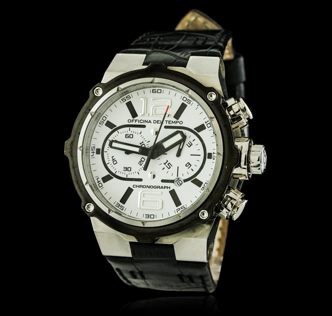 One gents Officina Del Tempo wristwatch featuring: Case: Stainless steel. Caseback: Stainless steel screw-down. Crown: Push/pull. Dial: White with black luminescent hands. The dial also features black luminescent indexes and silver tone Arabic numerals. Subdials: one 60-second and one 24-hour. Calendar: Date between 4 and 5 o'clock. Bracelet: Black rubber. Water resistant: 100 meters.