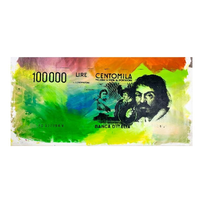 "Old Italan Lire Centomila" is limited edition hand pulled silkscreen unique mixed media on canvas by Andy Warhol protege Steve Kaufman (1960-2010). This piece is numbered and hand signed inverso and includes a letter of authenticity. As is common with Kaufman's works, this piece may have perceived minor flaws, but is in overall good condition. Measures approximately 24" x 47" before cropping.
