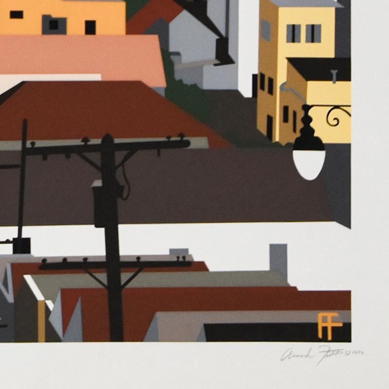 Old Neighborhood by Armond Fields (1930-2008). "Old Neighborhood" is a limited edition hand pulled original serigraph on paper by Armond Fields (1930-2008), numbered and hand signed by the artist. Includes Letter of Authenticity. Measures approx. 31.5" x 26" (border), 28" x 22" (image).