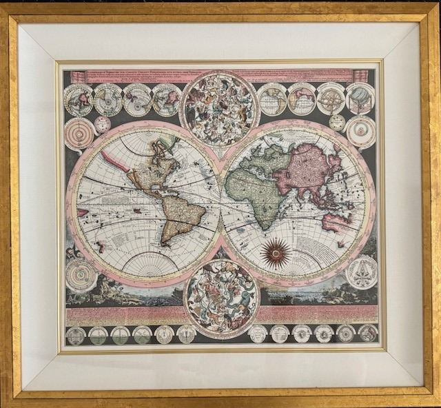 A beautifully framed reproduction on paper of an Old World Map by unknown artist, measures 28.75 x 26.5" framed