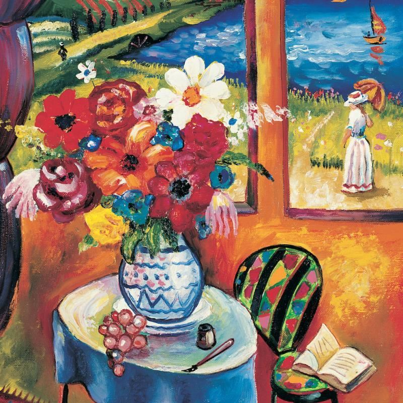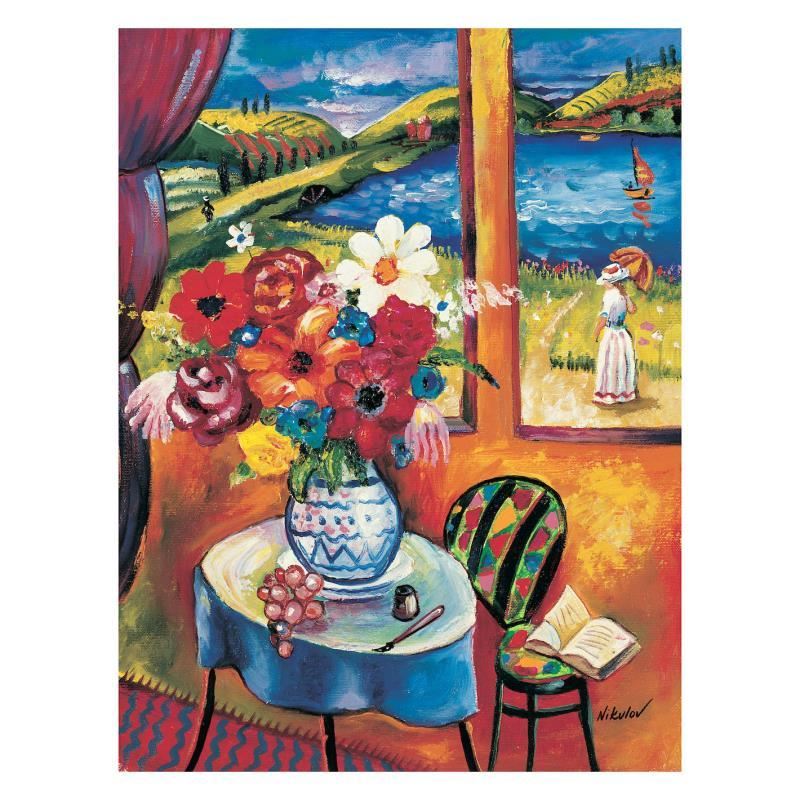 "Flower Vase with Countryside View" is a limited edition Giclee on Canvas by Oleg Nikulov. The piece is numbered, hand signed by the artist, and come with a letter of authenticity. Measures approximately 16" x 12".