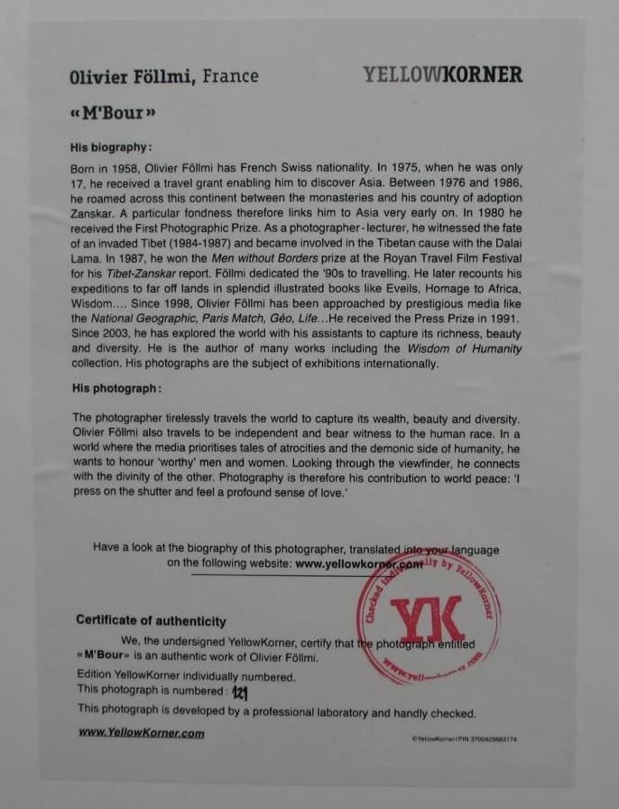 M'Bour Certified Photograph, Oliver Follmi YellowKorner Certified Photograph. Certificate of Authenticity from YellowKorner affixed to the back. Matted Dimensions 16"x20". Protected with Clear Mylar Sleeve.