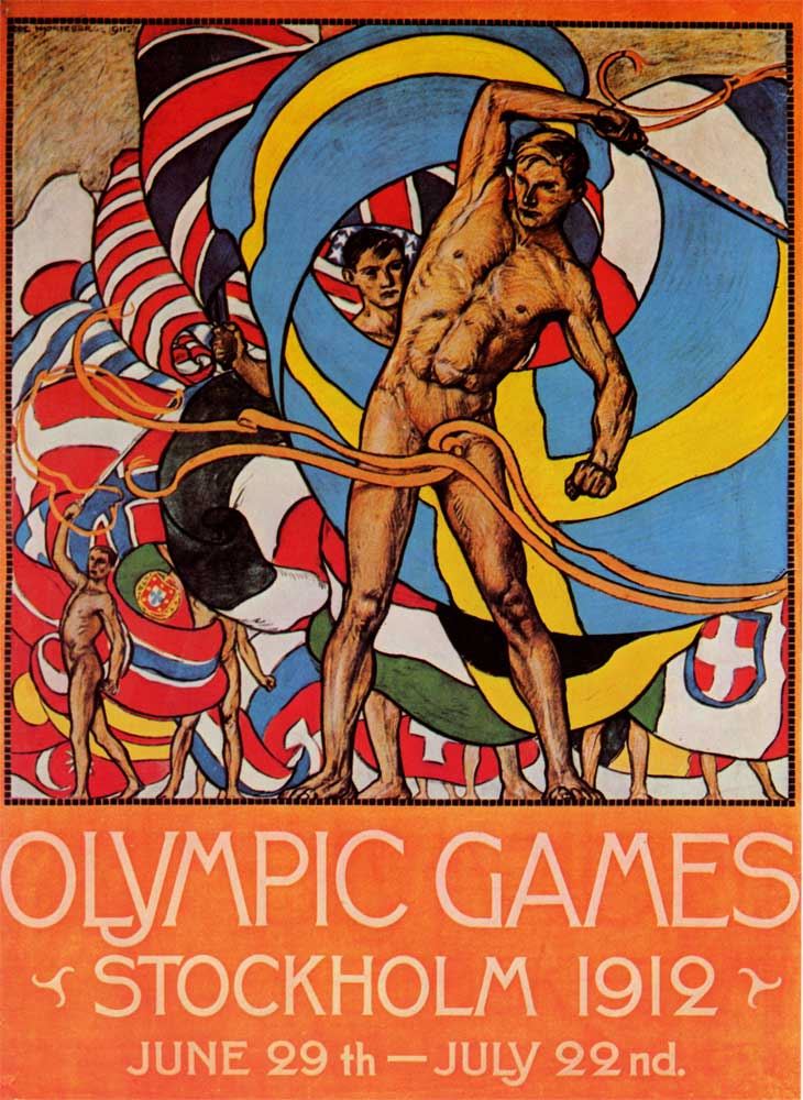 Artist: Olle Hjortzberg Title: Olympics 1912 Medium: Fine Art Reproduction Giclee on Canvas Image Size: Approximately 27.25 inches x 20 inches Unframed on Unstretched Canvas The task of creating the most lasting visual image of this Olympic campaign was entrusted to Swedish painter and illustrator Olle Hjortzberg (1872-1959), who recognized the efficacy of poster art and its power in advertising. Ignoring the specifics of the games themselves, he concentrated instead on classical perceptions of the human body and the portrayal of this Olympiad as an intertwined global venue. Adapted to the needs of particular markets and to standards of propriety in cultures far removed from the one in which it was created, this image spread worldwide.