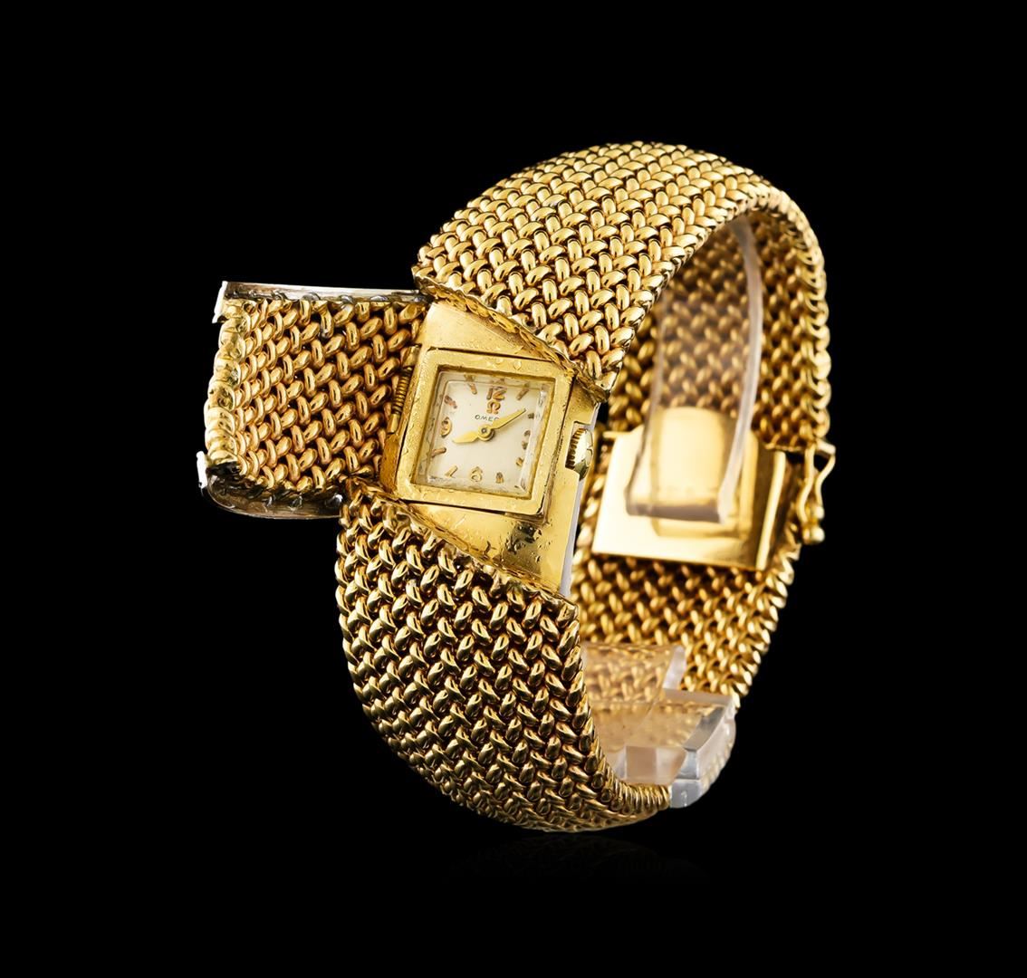 One ladies, vintage Omega Case Cover wristwatch electronically tested 14KT yellow gold, Case: 18 x 14mm, Case Back: space available for engraving, Crown: scalloped with logo, Bezel: polished, Crystal: acrylic. Omega Swiss Movement: seventeen jewel two position adjustment mechanical, stem wind, Omega signed Dial: Cream color with pointed hands, numerals and indices, Bracelet: 14KT yellow gold flexible mesh, Condition: G-5 Fine. Concealed clasp, with twin safeties. The seven inch length twenty three millimeter (one inch) wide 14KT yellow gold continuous mesh bracelet features an Omega watch under a diamond and gold case cover. The hinged continuous pattern mesh case cover is framed by two diagonal rows of diamonds. Containing: Fourteen bead set round brilliant cut diamonds, measuring 2.60 - 2.50mm in diameter, (depth est.) approximate total weight of Stones = 0.95ct. Graded in the setting. Clarity: VVS-2 to VS-1. Color: F - G. Total Weight of Diamonds 0.95ct. Total Weight of Watch 88.57gm. AIG Appraised at $9,050.00.