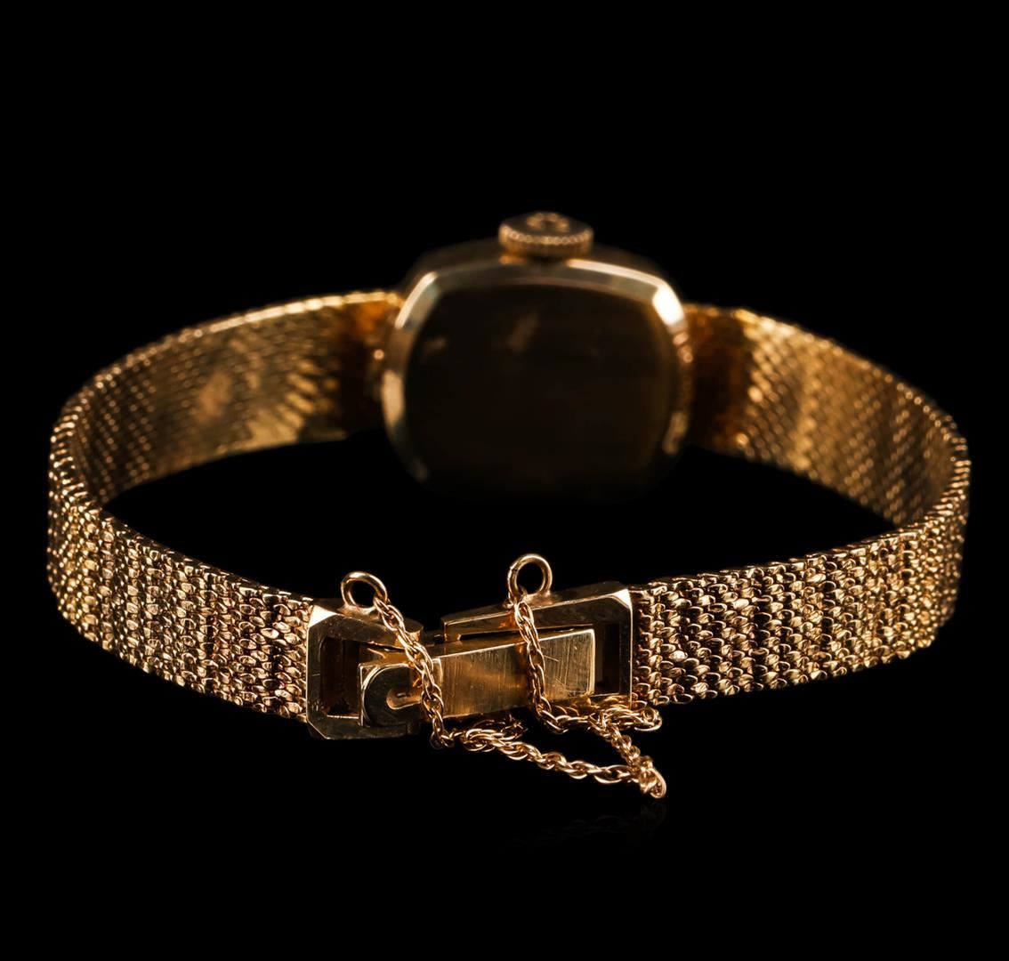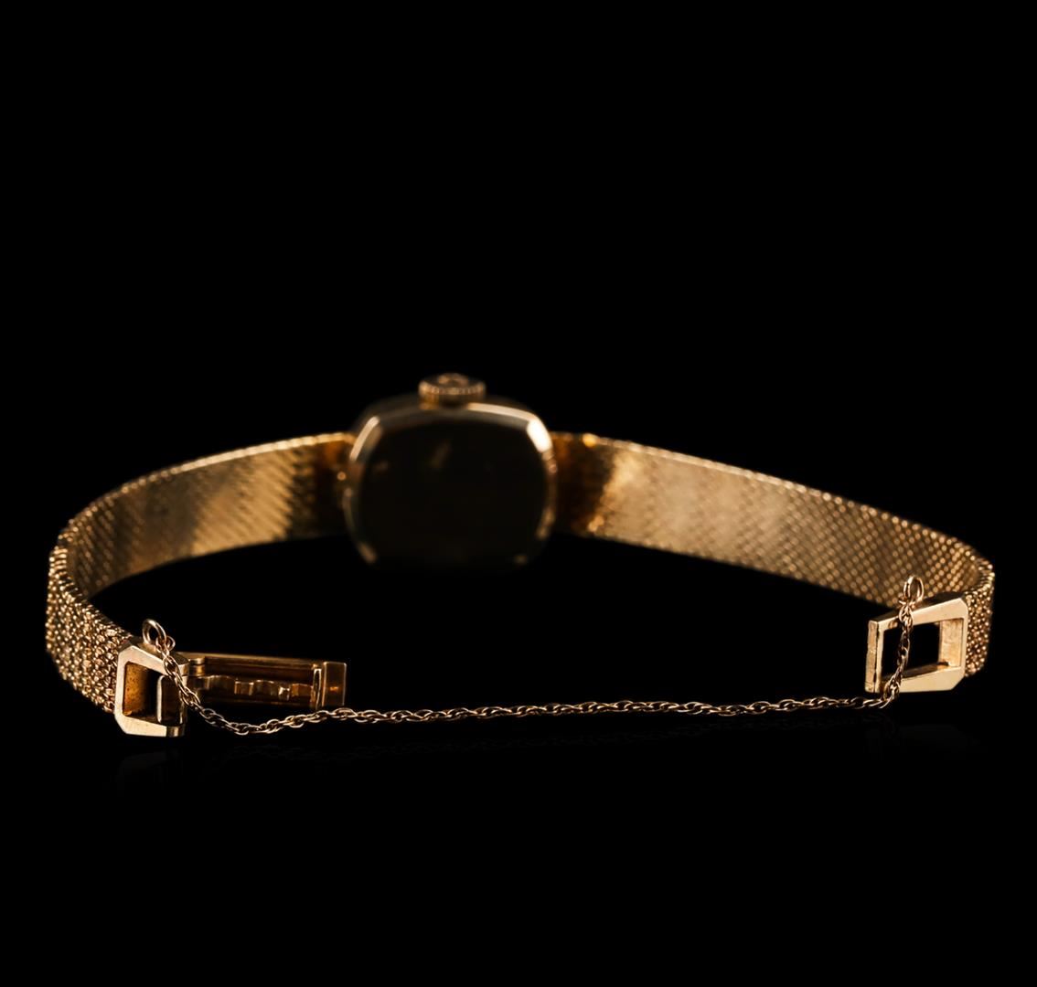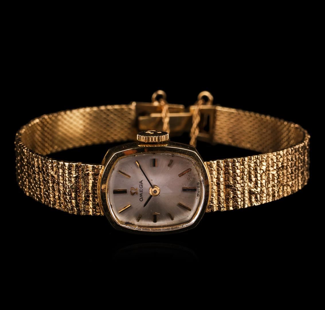 One ladies, vintage Omega wristwatch electronically tested 14KT yellow gold, Case: 16 x 14mm, Case Back: space is available for engraving, Crown: scalloped with high relief logo, Crystal: acrylic lens, Bezel: high polish finish. Movement: Omega Swiss, seventeen jewel unadjusted mechanical stem wind, Omega signed Dial: with pointed narrow hands and indices, Omega Integral Bracelet: 14KT yellow gold, flexible patterned mesh, Condition: G-5 Fine. Six inch length adjustable. Total Weight of Watch 17.10gm. AIG Appraised at $2,990.00.