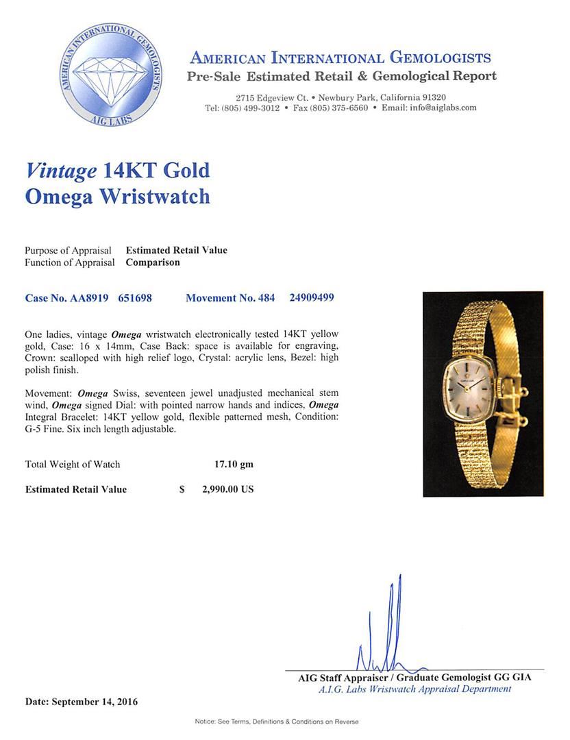 One ladies, vintage Omega wristwatch electronically tested 14KT yellow gold, Case: 16 x 14mm, Case Back: space is available for engraving, Crown: scalloped with high relief logo, Crystal: acrylic lens, Bezel: high polish finish. Movement: Omega Swiss, seventeen jewel unadjusted mechanical stem wind, Omega signed Dial: with pointed narrow hands and indices, Omega Integral Bracelet: 14KT yellow gold, flexible patterned mesh, Condition: G-5 Fine. Six inch length adjustable. Total Weight of Watch 17.10gm. AIG Appraised at $2,990.00.