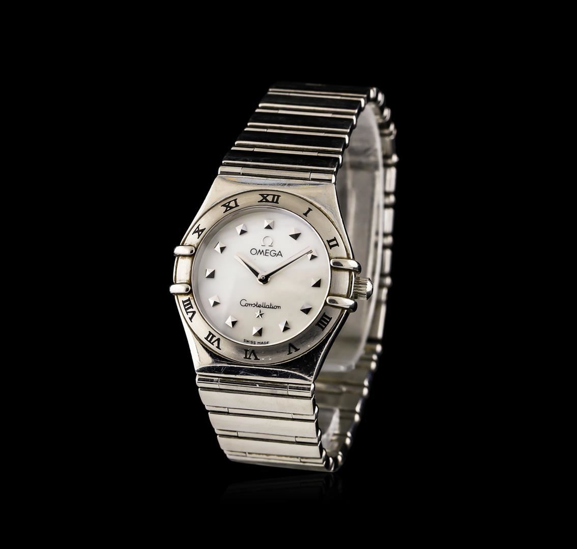 One ladies, Omega Constellation Mini wristwatch electronically tested Stainless Steel, Case: 25mm, Case Back: the Cupola of the Observatory of Geneva in high relief, Scalloped Crown: with logo, Fixed Bezel: engraved with Roman numerals, Crystal: synthetic sapphire lens. Movement: quartz, Omega signed Dial: mother of pearl, with pointed hands and indices, Bracelet: integrated factory stainless steel full bar link, Condition: G-5 Fine. Six and one half inch length. Omega push button deployment clasp. Total Weight of Watch 49.60gm. AIG Appraised at $2,250.00.