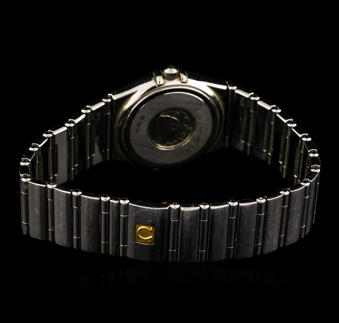 One ladies, Omega Constellation Mini wristwatch electronically tested Stainless Steel, Case: 25mm, Case Back: the Cupola of the Observatory of Geneva in high relief, Scalloped Crown: with logo, Fixed Bezel: engraved with Roman numerals, Crystal: synthetic sapphire lens. Movement: quartz, Omega signed Dial: mother of pearl, with pointed hands and indices, Bracelet: integrated factory stainless steel full bar link, Condition: G-5 Fine. Six and one half inch length. Omega push button deployment clasp. Total Weight of Watch 49.60gm. AIG Appraised at $2,250.00.