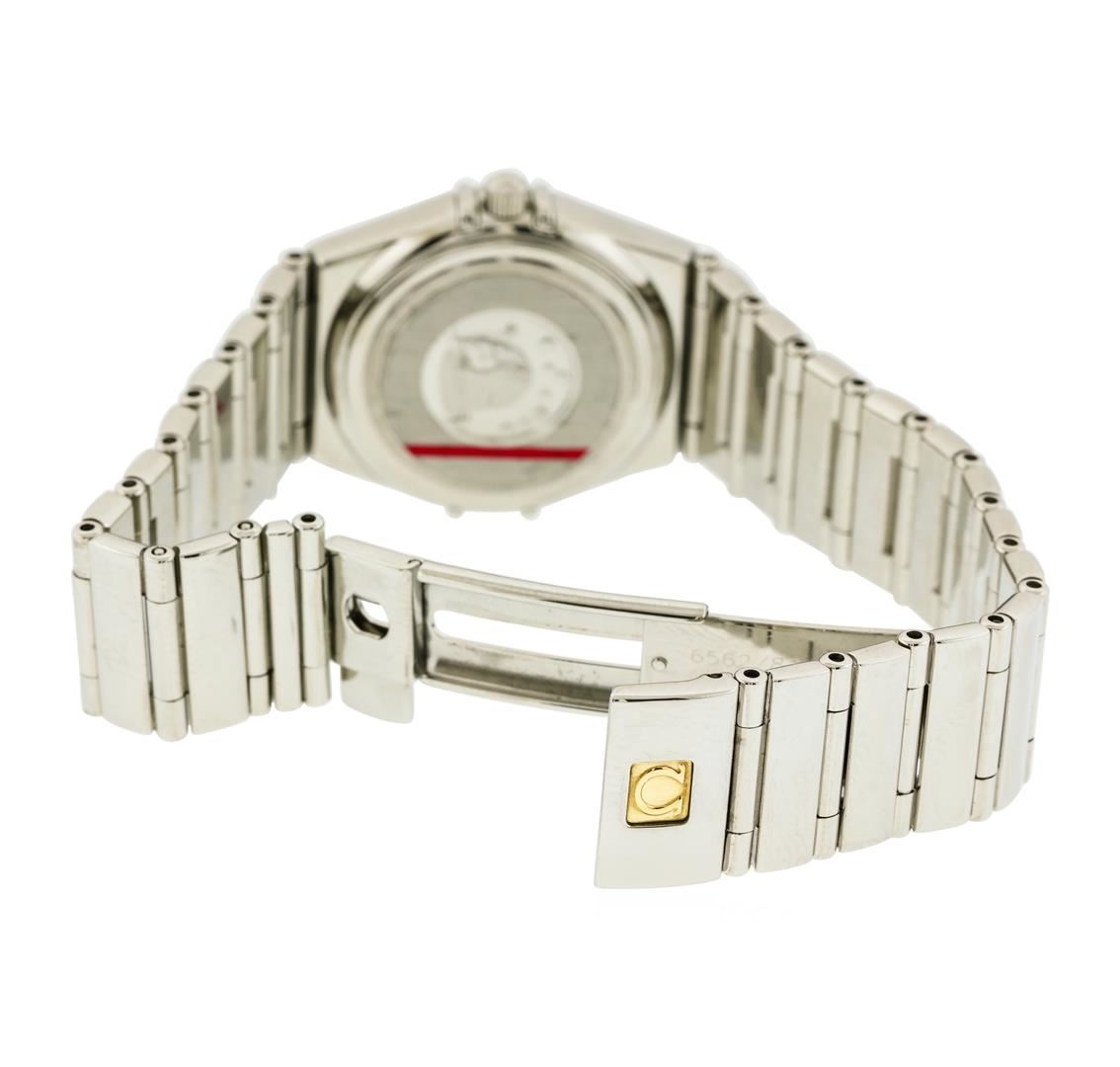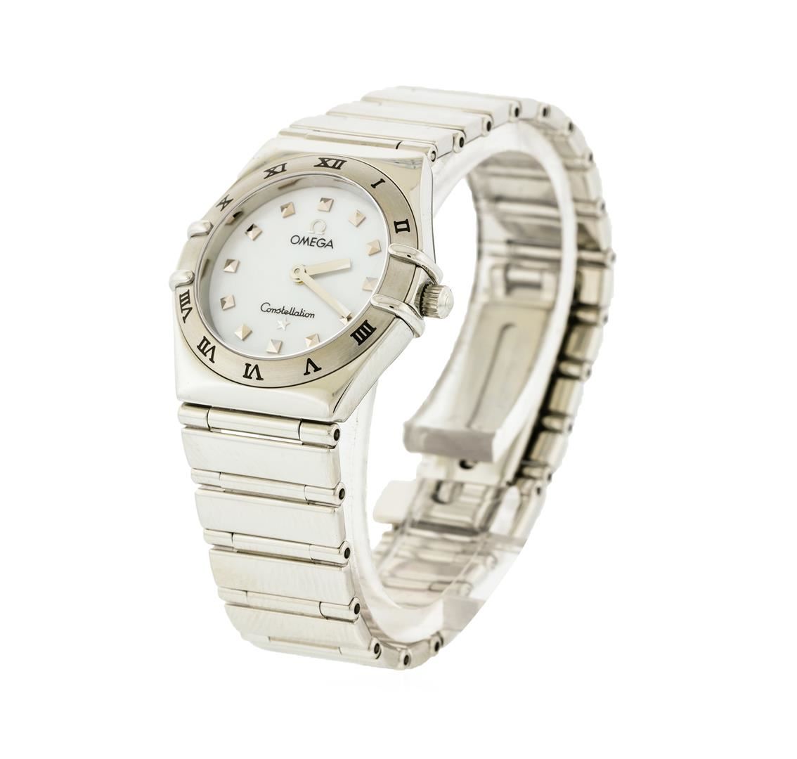 One ladies, Omega Constellation Mini wristwatch electronically tested Stainless Steel, Case: 25mm, Case Back: the Cupola of the Observatory of Geneva in high relief, Scalloped Crown: with logo, Fixed Bezel: engraved with Roman numerals, Crystal: synthetic sapphire lens. Movement: quartz, Omega signed Dial: mother of pearl, with baton hands and raised indices, Bracelet: integrated factory stainless steel full bar link, Condition: G-7 Near Mint. Six and one quarter inch length. Omega push button deployment clasp. Total Weight of Watch 48.33gm. AIG Appraised at $2,990.00.
