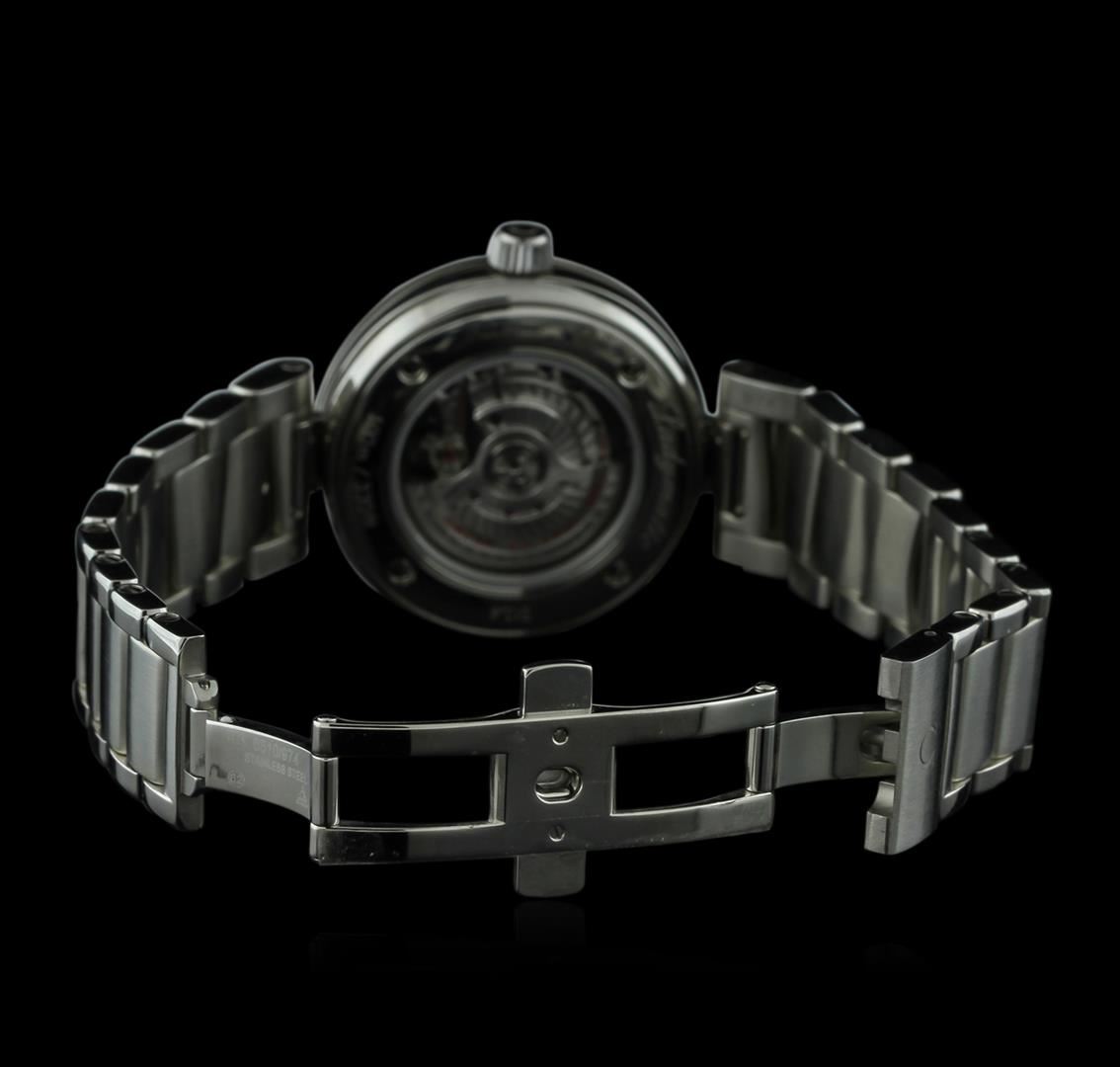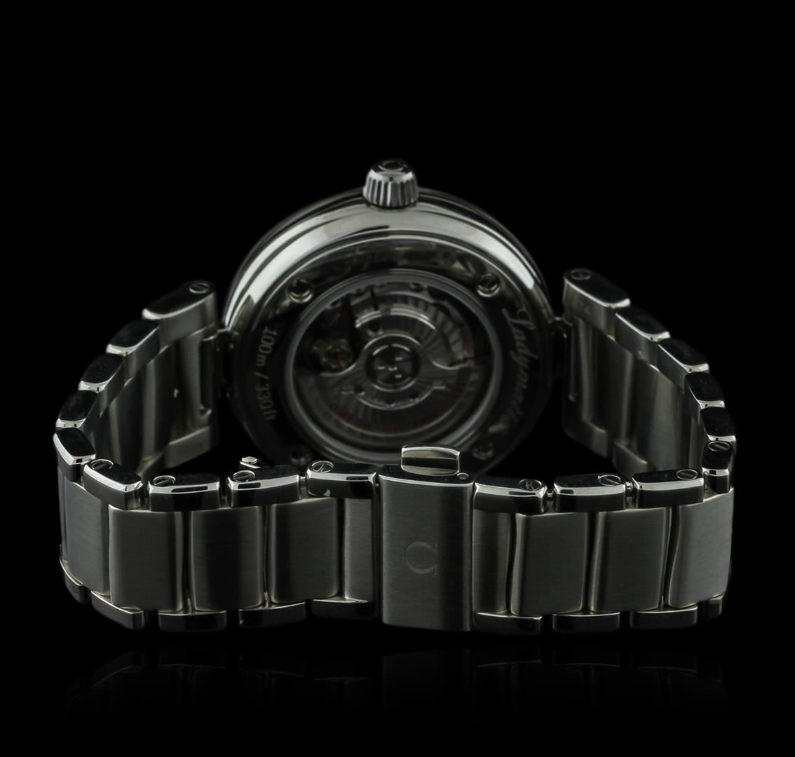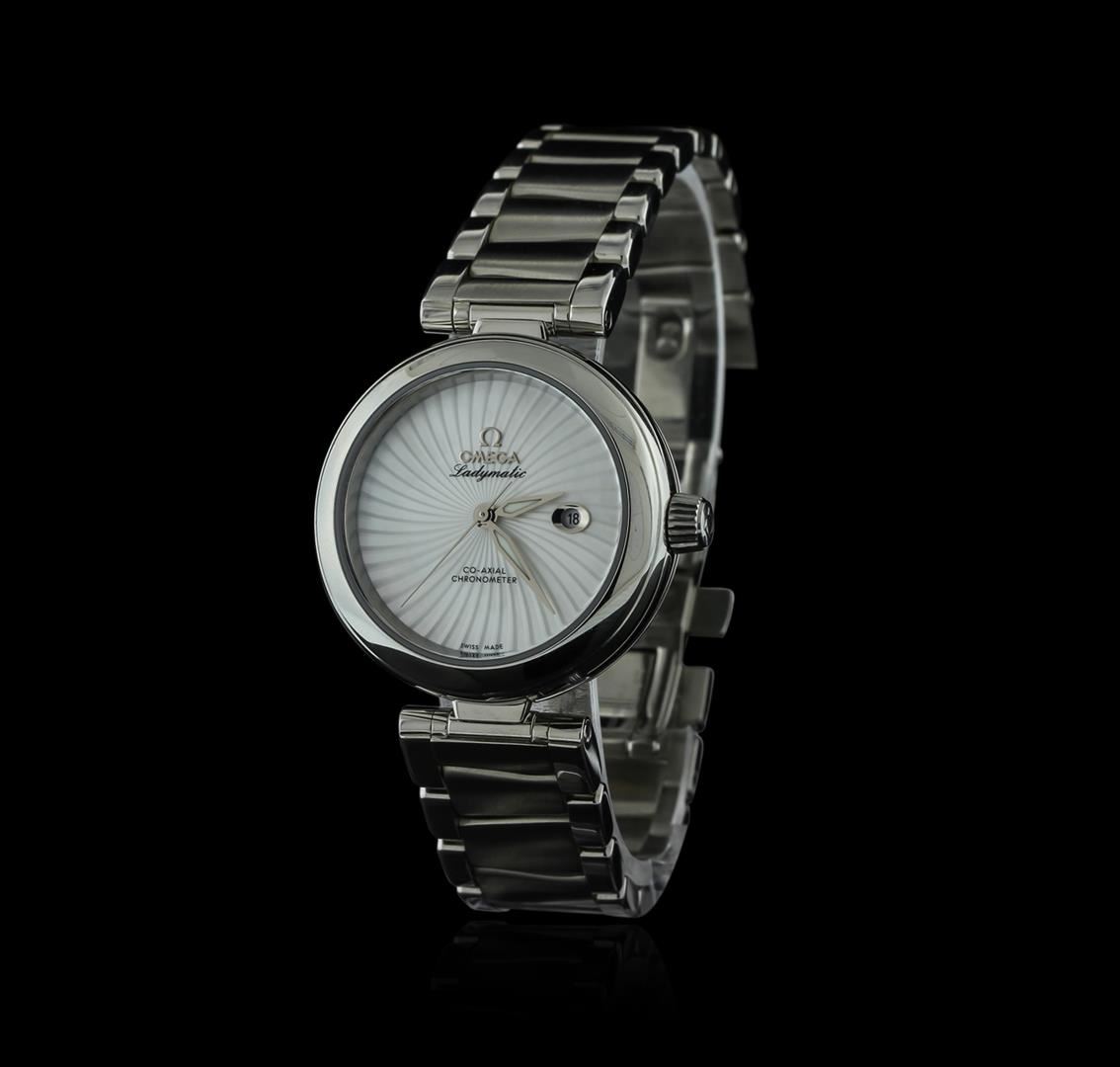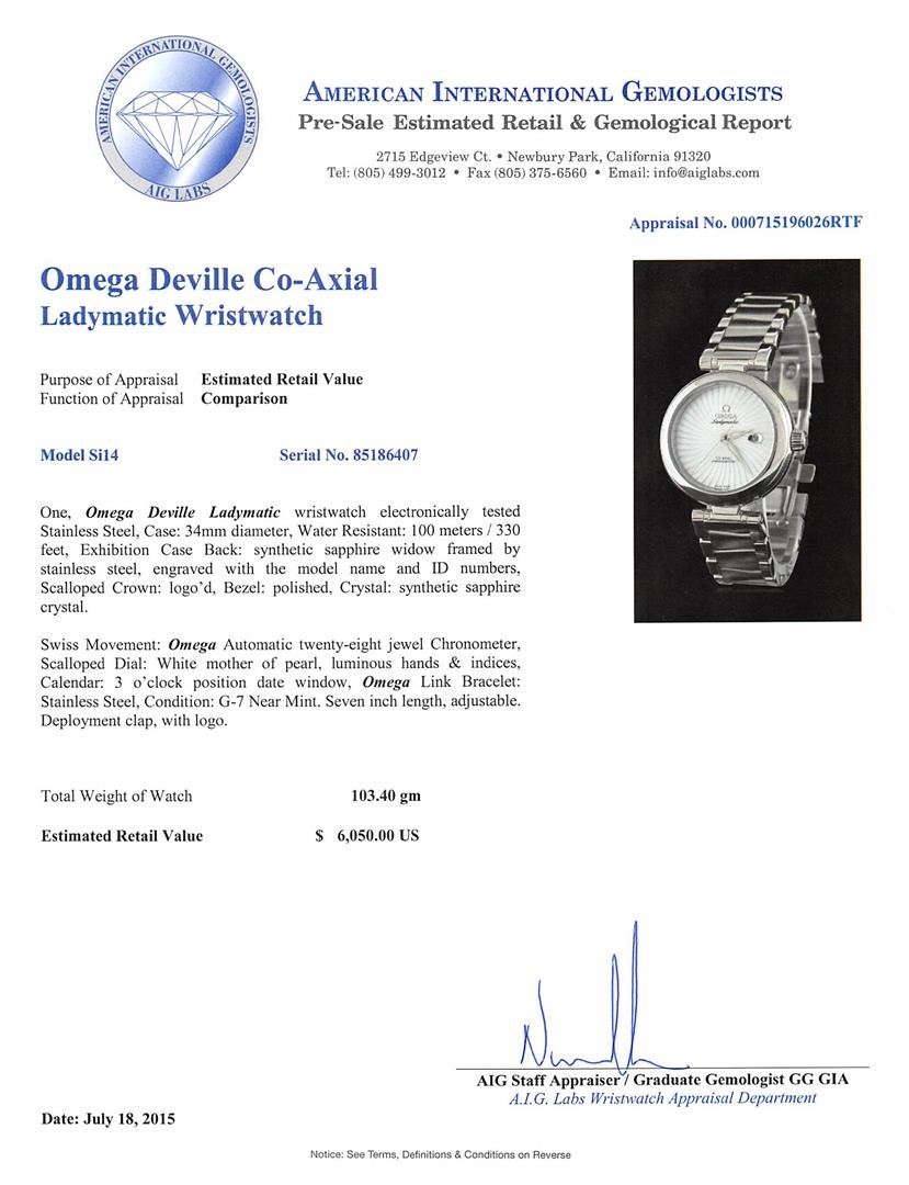 One, Omega Deville Ladymatic wristwatch electronically tested Stainless Steel, Case: 34mm diameter, Water Resistant: 100 meters / 330 feet, Exhibition Case Back: synthetic sapphire widow framed by stainless steel, engraved with the model name and ID numbers, Scalloped Crown: logo'd, Bezel: polished, Crystal: synthetic sapphire crystal. Swiss Movement: Omega Automatic twenty-eight jewel Chronometer, Scalloped Dial: White mother of pearl, luminous hands & indices, Calendar: 3 o'clock position date window, Omega Link Bracelet: Stainless Steel, Condition: G-7 Near Mint. Seven inch length, adjustable. Deployment clap, with logo. Total Weight of Watch 103.40gm. AIG Appraised at $6,050.00.
