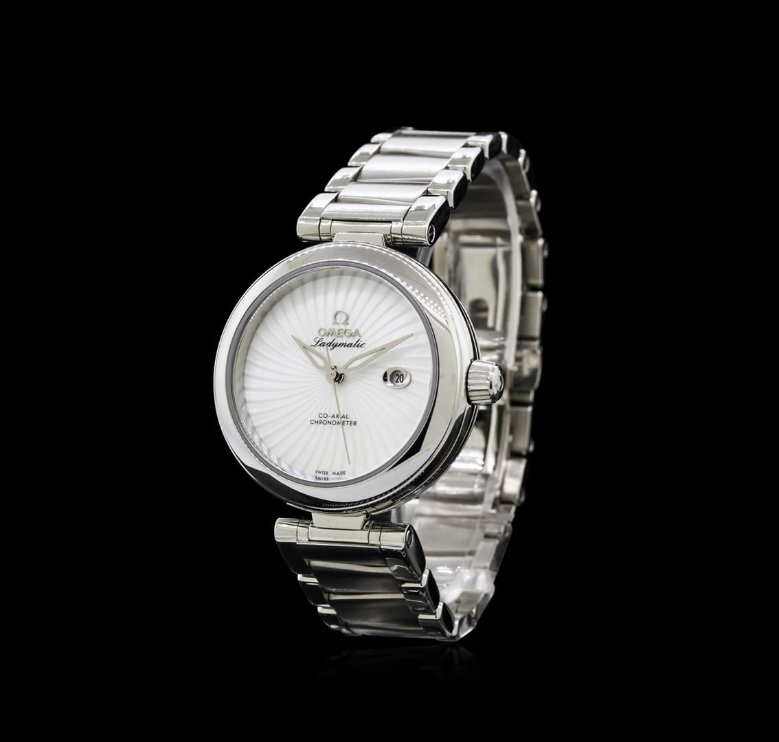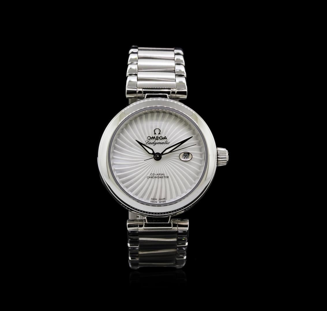 One, Omega Deville Ladymatic wristwatch electronically tested Stainless Steel, Case: 34mm diameter, Water Resistant: 100 meters / 330 feet, Exhibition Case Back: synthetic sapphire widow framed by stainless steel, engraved with the model name and ID numbers, Scalloped Crown: logo'd, Bezel: polished, Crystal: synthetic sapphire crystal. Swiss Movement: Omega Automatic twenty-eight jewel Chronometer, Scalloped Dial: White mother of pearl, luminous hands & indices, Calendar: 3 o'clock position date window, Omega Link Bracelet: Stainless Steel, Condition: G-7 Near Mint. Seven inch length, adjustable. Deployment clap, with logo. Total Weight of Watch 103.40gm. AIG Appraised at $6,050.00.