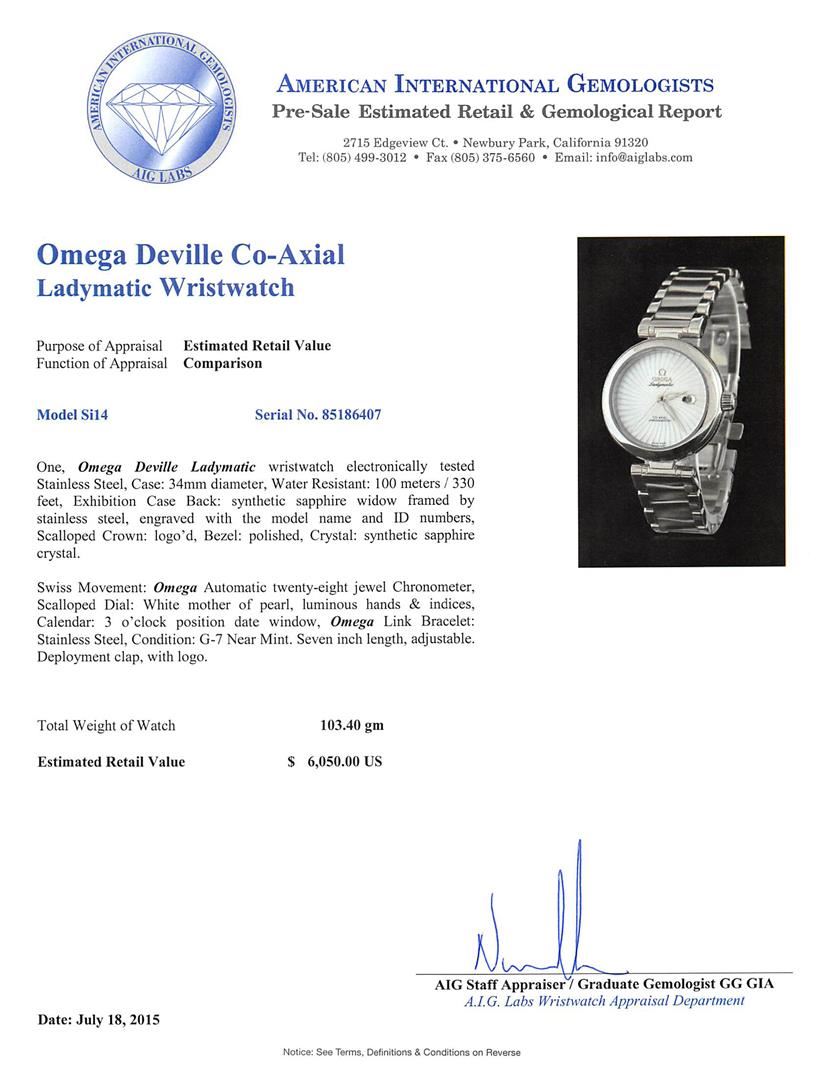 One, Omega Deville Ladymatic wristwatch electronically tested Stainless Steel, Case: 34mm diameter, Water Resistant: 100 meters / 330 feet, Exhibition Case Back: synthetic sapphire widow framed by stainless steel, engraved with the model name and ID numbers, Scalloped Crown: logo'd, Bezel: polished, Crystal: synthetic sapphire crystal. Swiss Movement: Omega Automatic twenty-eight jewel Chronometer, Scalloped Dial: White mother of pearl, luminous hands & indices, Calendar: 3 o'clock position date window, Omega Link Bracelet: Stainless Steel, Condition: G-7 Near Mint. Seven inch length, adjustable. Deployment clap, with logo. Total Weight of Watch 103.40gm. AIG Appraised at $6,050.00.
