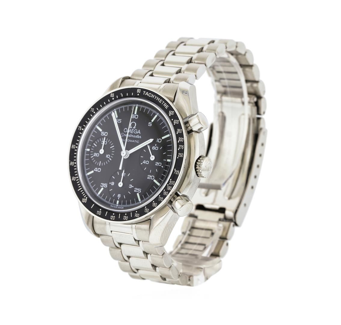 One gents, Omega Speedmaster wristwatch electronically tested Stainless Steel, Case: 39mm, Case Back: engraved in high relief with the manufacturer logo, and model name, Water Resistant: 50 meters / 165 feet, Fixed Bezel: with Tachymetre function, Crystal: Domed acrylic lens. Movement: Automatic, with an approximate 48 hour Power reserve, Chronograph Functions: three sub-dials for; continuous seconds, minutes and hours, Omega signed Dial: Black color, luminous hands & indices, Omega Bracelet: Stainless Steel link, Condition: G-5 Fine. Seven and one half inch length, adjustable. Omega Speedmaster clasp, with logo. Total Weight of Watch 102.33gm. AIG Appraised at $4,150.00.