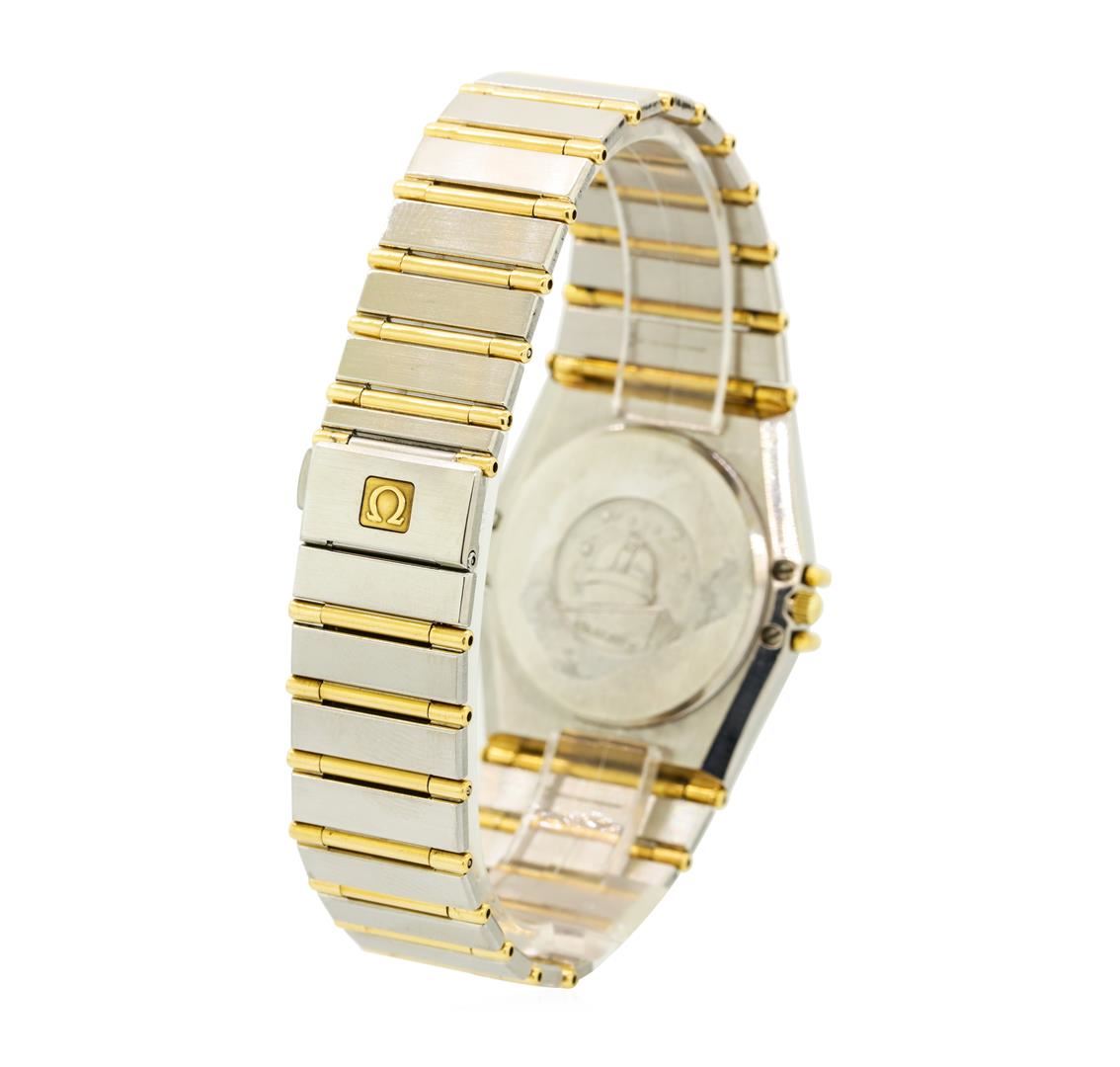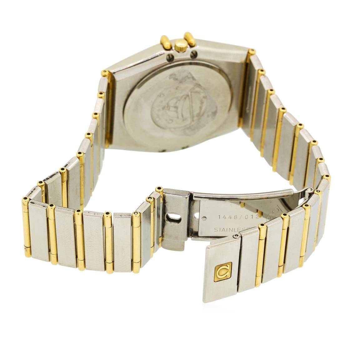One, Omega two-tone Constellation wristwatch electro-chemically tested.Stainless Steel Case: 34mm, Case Back: engraved with the Cupola of the Observatory of Geneva, 18KT yellow gold Crown: scalloped with high relief Omega logo, 18KT Yellow gold Fixed Bezel: engraved with Roman numerals, Crystal: synthetic sapphire lens.Movement: quartz, Omega signed Dial: Black color, with luminous hands and indices, Gold color Sub Dials: one for weekdays and one for the date. Omega Bracelet: integrated factory stainless steel & 18KT yellow gold full bar link, Condition: G-5 Fine. Seven and one half inch length, with a push button deployment clasp. Total Weight of Watch 79.21gm. AIG Appraised at $6,050.00.