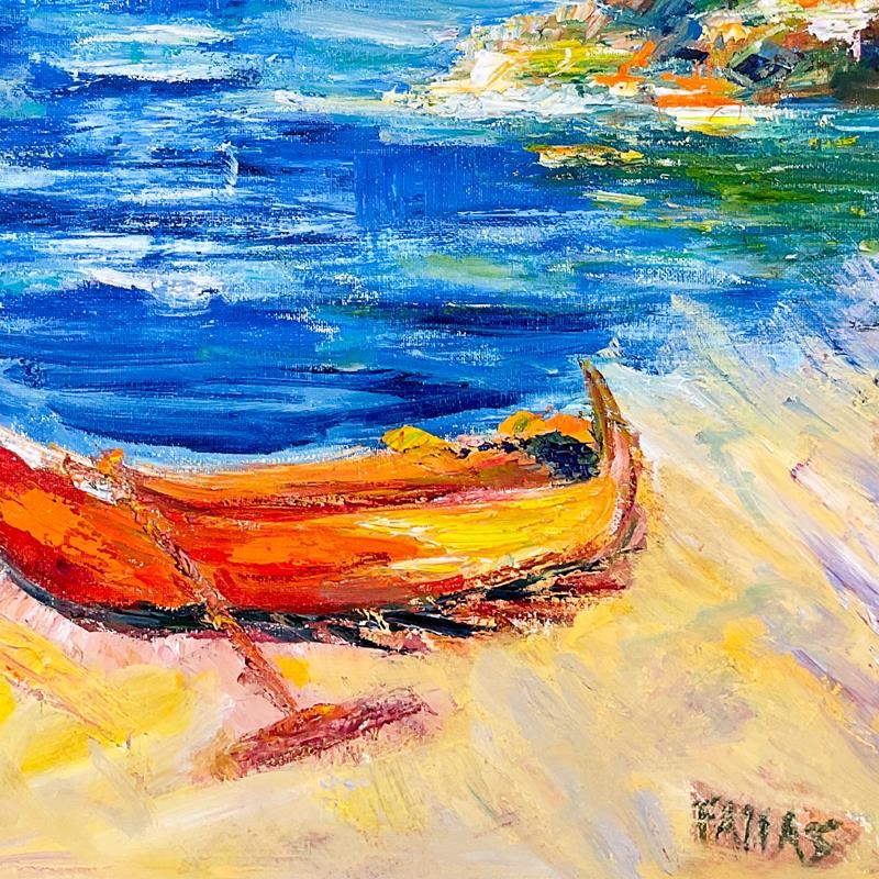 "On the Beach" is an original oil painting on stretched canvas by Elliot Fallas, hand signed by the artist. Includes Letter of Authenticity. Measures approx. 20" x 16" (image). The sides of the canvas are painted and it can be hung as is, but a frame is definitely recommended.