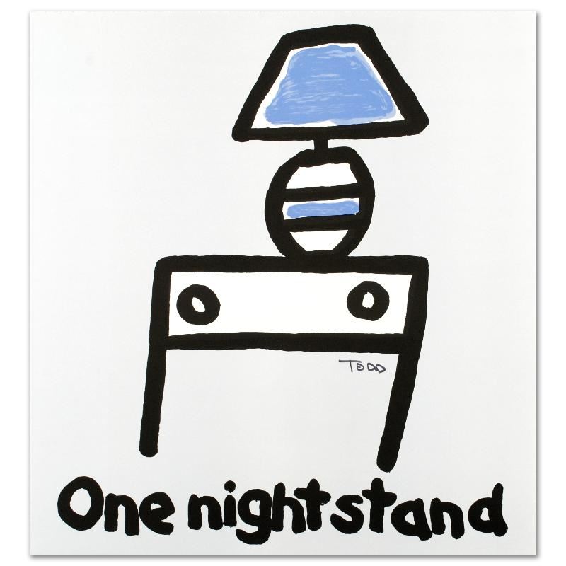 Pop artist Todd Goldman is known all across the globe for his whip-smart and wickedly funny puns and pictures! "One Night Stand" is a limited edition lithograph on paper, numbered and hand signed by Todd. Includes Certificate of Authenticity! Measures approx. 21" x 22" (no border).