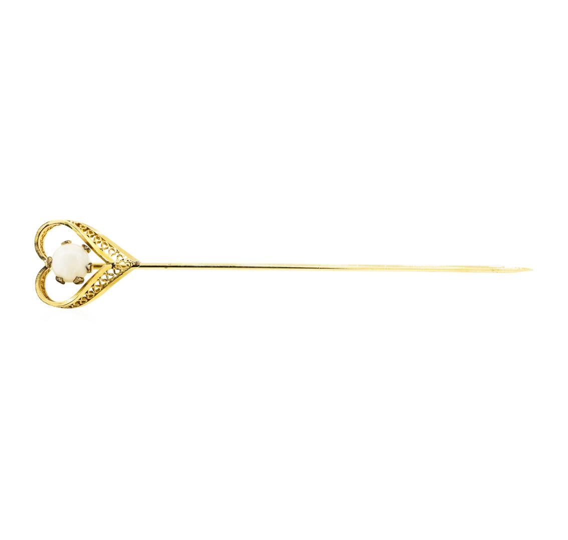 One yellow gold plated heart shaped stick pin weighing 1.0 grams featuring one oval cabochon cut opal.