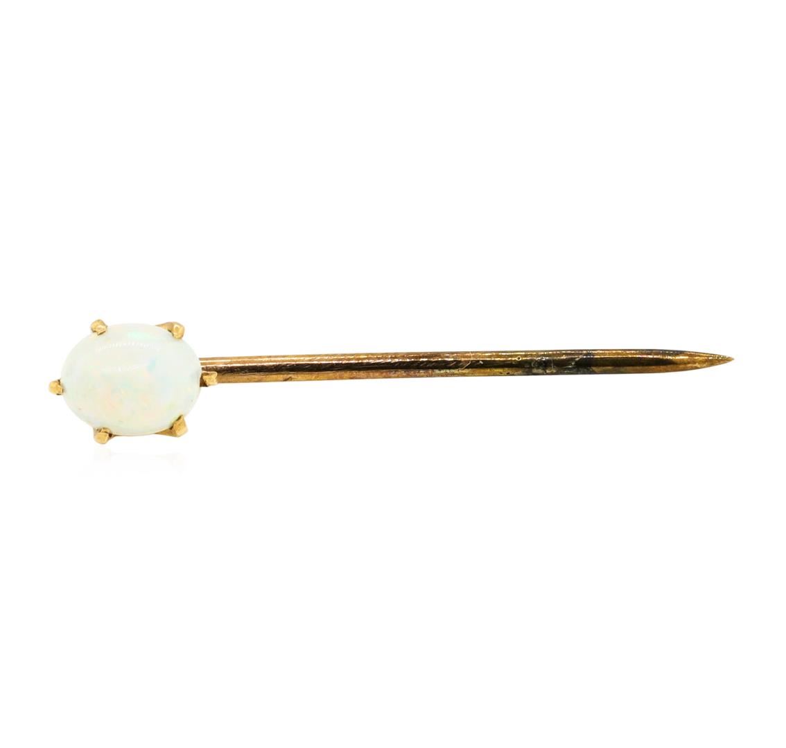One stick pin featuring: 10KT yellow gold weighing 0.5 grams containing one oval cabochon cut opal measuring 5.40mm x 4.3mm.