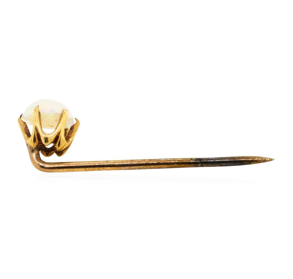 One stick pin featuring: 10KT yellow gold weighing 0.5 grams containing one oval cabochon cut opal measuring 5.40mm x 4.3mm.
