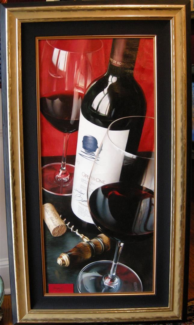 A bright red background provides the contrast to Dmitriy Volkov's 2000 Opus One oil on canvas, as the bottle adjoins two wine glasses, corkscrew and cork. The painting measures 35.5 x 16; framed image measures approx. 47.5 x 28.