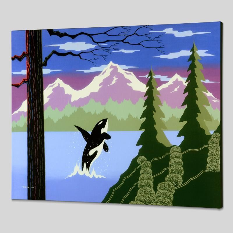 Larissa Holt, a student of distinguished artist Eyvind Earle (1916-2000), uses bold colors and breathtaking scenery to create images of Nature in her own unique style. "Orca" is a limited edition giclee on stretched canvas by Holt, numbered and bearing Holt's authorized signature. This piece comes gallery wrapped. Includes Letter of Authenticity. Measures approx. 27" x 21.5" x 1.5" (image). This item requires special handling and may have a longer than usual turnaround.