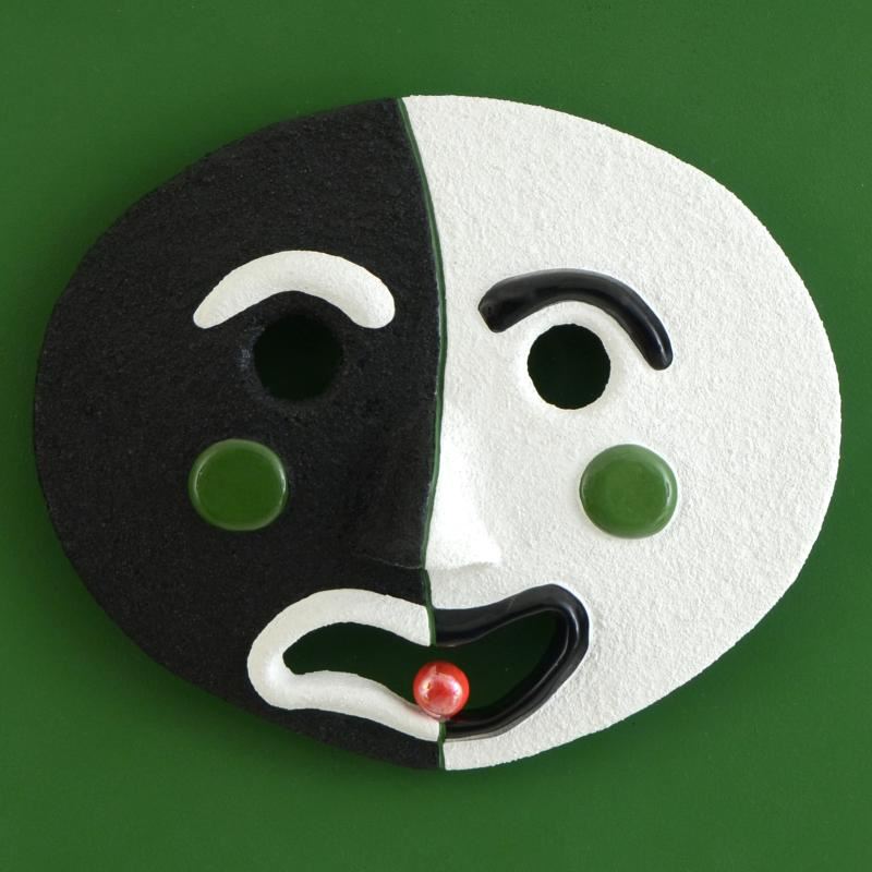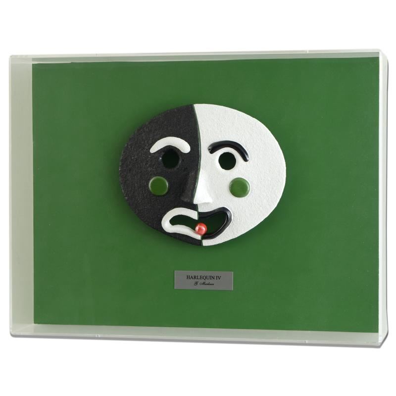 "Harlequin IV" is an original hand-made ceramic mask sculpture by George Marlowe! Includes Certificate of Authenticity! The box frame measures approx. 24.5" (width) x 18.5" (height), 5" (depth); 9lb (total weight). The mask measures approx. 11" (width) x 9" (height).