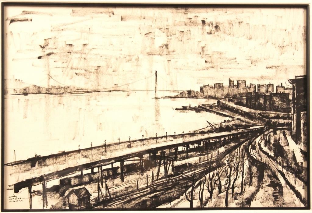 This is an original ink on paper by listed California artist Francis De Erdley. This artist holds auction records to $41,000. Gallery framed in museum quality black filet, crème matte and black/antiqued gold frame. Spectacular work form an artist with works held by museums all over the world. This original work is titled "New York", dated 1939 in Roman Numerals, and signed Lower Left. This piece measures 26" x 33" framed and 21" x 14" unframed. Valued between $6,000-$7,000.00.