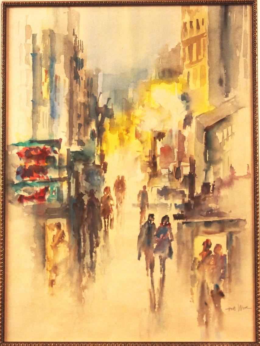 Original watercolor of city street - mid century modern artist Hoe Won measuring 14" x 19" unframed and 27" x 33" framed. Framed in gorgeous bronze washed frame with crème matt and bronze filet. Signed lower right. Valued between $1,700-$2,000.