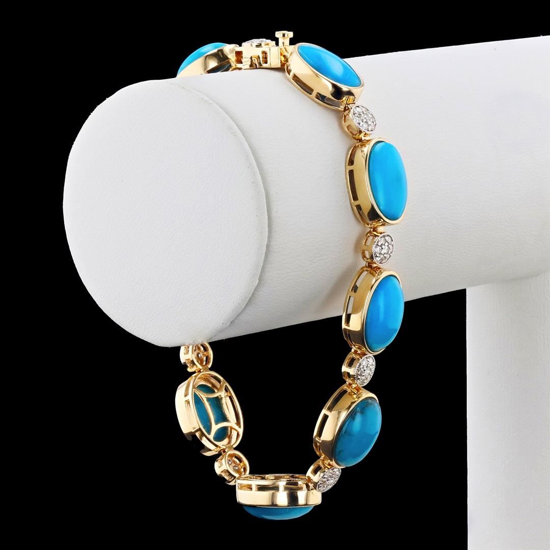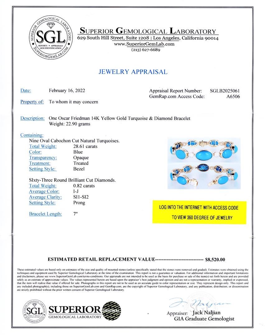 Oscar Friedman 14K Yellow Gold Turquoise and Diamond Bracelet. Please see Photos and Description for all available information. Oscar Friedman's 14K Yellow Gold Turquoise and Diamond Bracelet is an elegant and dazzling piece for men and women alike. This handmade 14K Yellow Gold Bracelet is made of 9 Oval Cabochon Cut Natural Turquoise gems weighing 28.61ctw and 7-inch 14K Yellow Gold Bracelet,63 Diamonds weighing 0.82ctw. The Turquoise gemstones are cut into round, oval, and marquise shapes and display vivid, earth