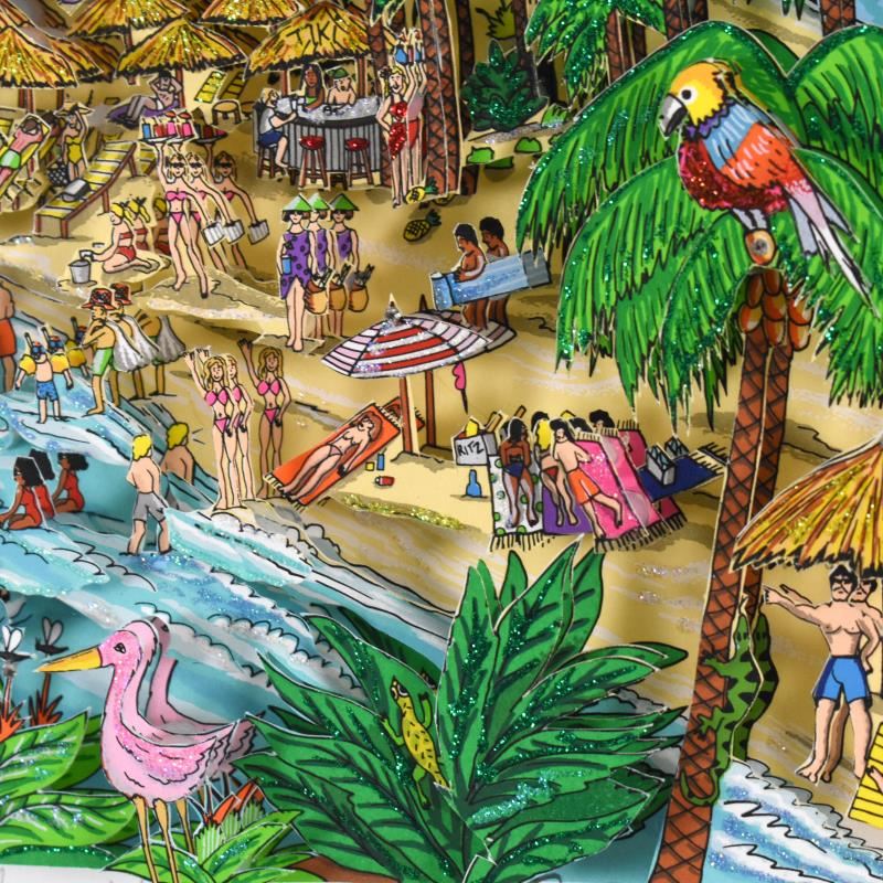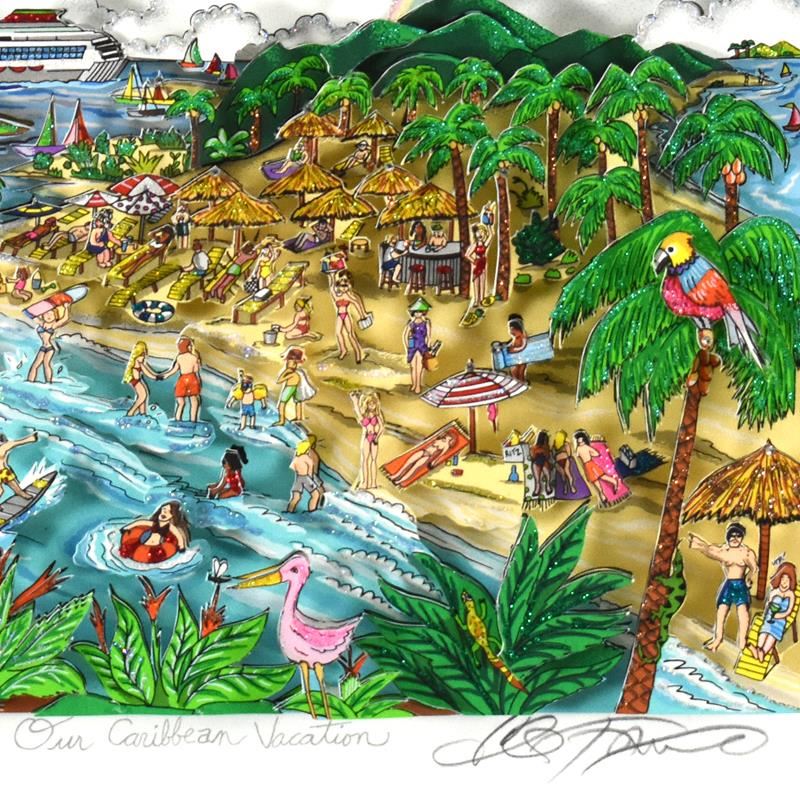 "Our Caribbean Vacation" is a 3D limited edition silk screen construct on paper by Charles Fazzino, DX numbered 130/350 and hand signed by the artist. This piece comes custom framed. Includes Certificate of Authenticity. Measures approximately 20" x 17" (framed), 12.5" x 9.5" (image).
