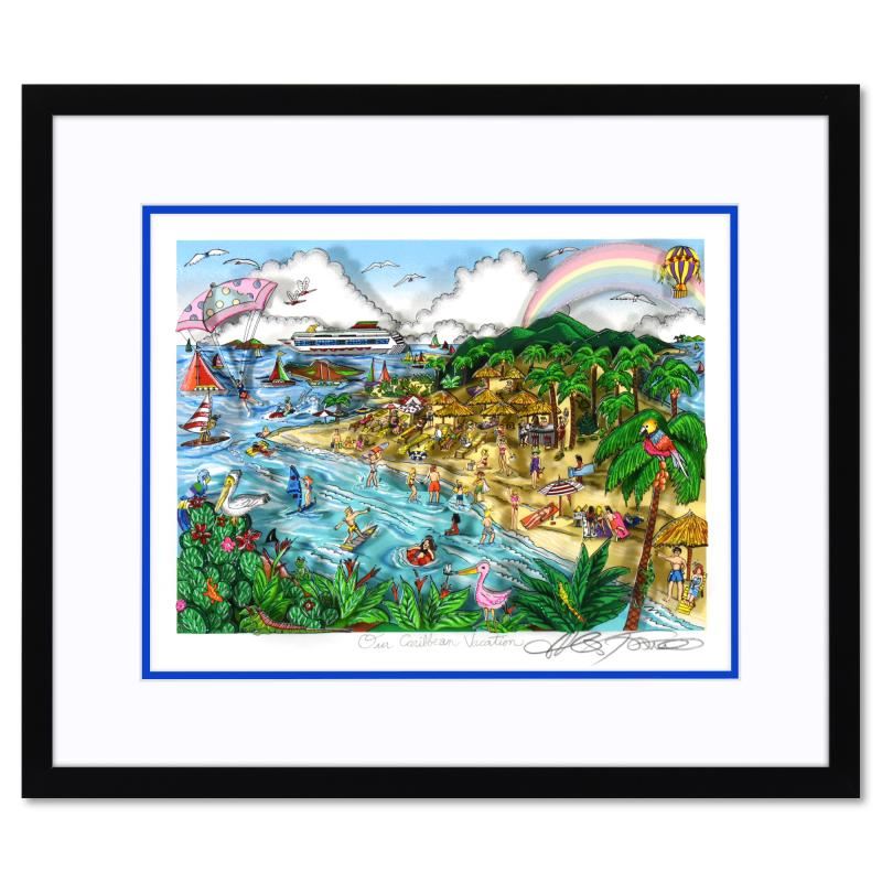 "Our Caribbean Vacation" is a 3D limited edition silk screen construct on paper by Charles Fazzino, DX numbered and hand signed by the artist. This piece comes custom framed. Includes Certificate of Authenticity. Measures approximately 20" x 17" (framed), 12.5" x 9.5" (image).