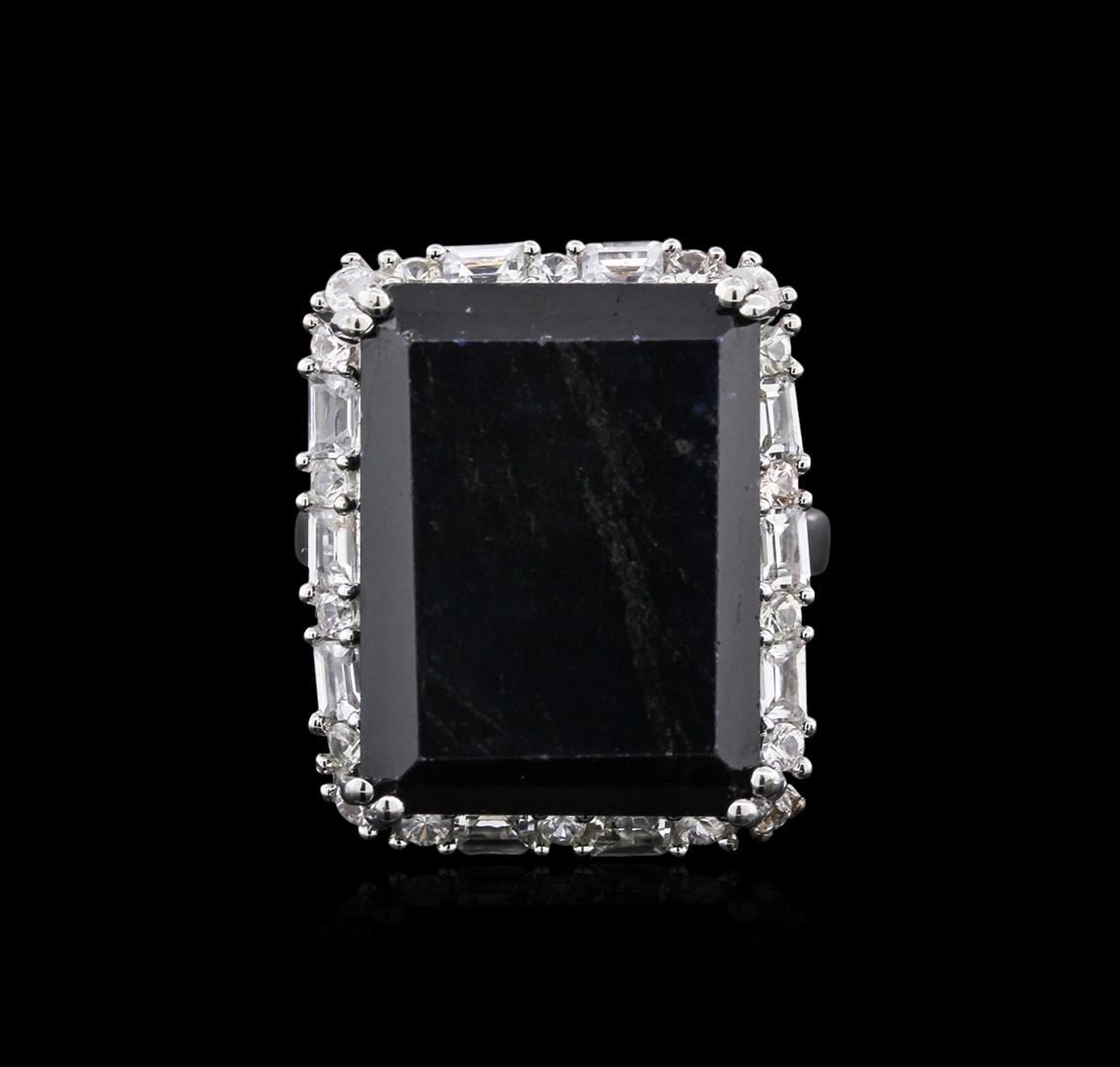 One ring featuring: platinum plated silver (white) weighing 11.00 grams containing one emerald (faceted) midnight blue sapphire with a total weight of 28.99ct. Quality: 3-4 Fair-Gd Range. Mmts: 20.00 x 15.07 mm (no depth). And round (faceted) colorless sapphires with a total weight of 1.56ct. Quality: 10 - Excellent-Fine. GLA Appraised at $5,580.00.