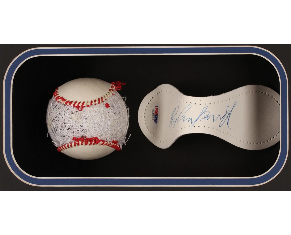 The incredible career of Roy Campanella came to a sad and unexpected end in a car accident that rendered him paralyzed prior to the start of the 1958 baseball season. A short time prior to his death and after nearly 34 years of paralysis, the Hall of Famer could not sign his name to any items. However, shortly after coming home from being hospitalized for 6 months, Roy started the time consuming task of signing a limited number of the flat skins of baseballs. It was impossible for Campanella to sign a baseball due to the curvature shape. The majority of these limited autographed skins were then made into Major League baseballs. Experts have said, "Due to the special circumstances surrounding Roy Campanella, a Campanella autographed baseball could possibly be one of the rarest baseball autographs of a famous Major League Baseball player ever. Even rarer is the few autographed skins that were never sewn back to complete a baseball." This incredible collage includes one of these very rare skins (PSA Certified), a true piece of baseball history. The collage measures 35 x 29 inches. Comes with Certificate of Authenticity. PSA Certified.