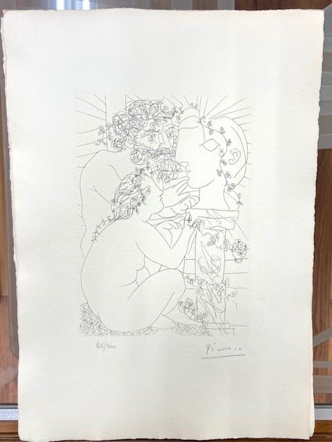 Pablo Picasso's "Sculpteur,Model accroupi et tete sculptee" is printed on the softest fine art paper this delicate 18x13" VOLLARD etching from 1933 is Estate signed but numbered 165/300 in pencil Pablo Picasso created the Suite Vollard between 1930 and 1939 in honor of his friend and art dealer, Amboise Vollard. The suite is comprised of 100 etchings, illustrating Picasso's most famous themes. In 1990, the Picasso family authorized an unprecedented print recreation, faithfully rendered, of these exceptional artworks. This authorized recreation, produced in a limited edition of 300, was published by the prestigious German Museum, Stadtichen Mulheim an der Ruhr. The paper used for this edition is the same rare, high quality paper used by Picasso to print the Suite Vollard during the 1930's.