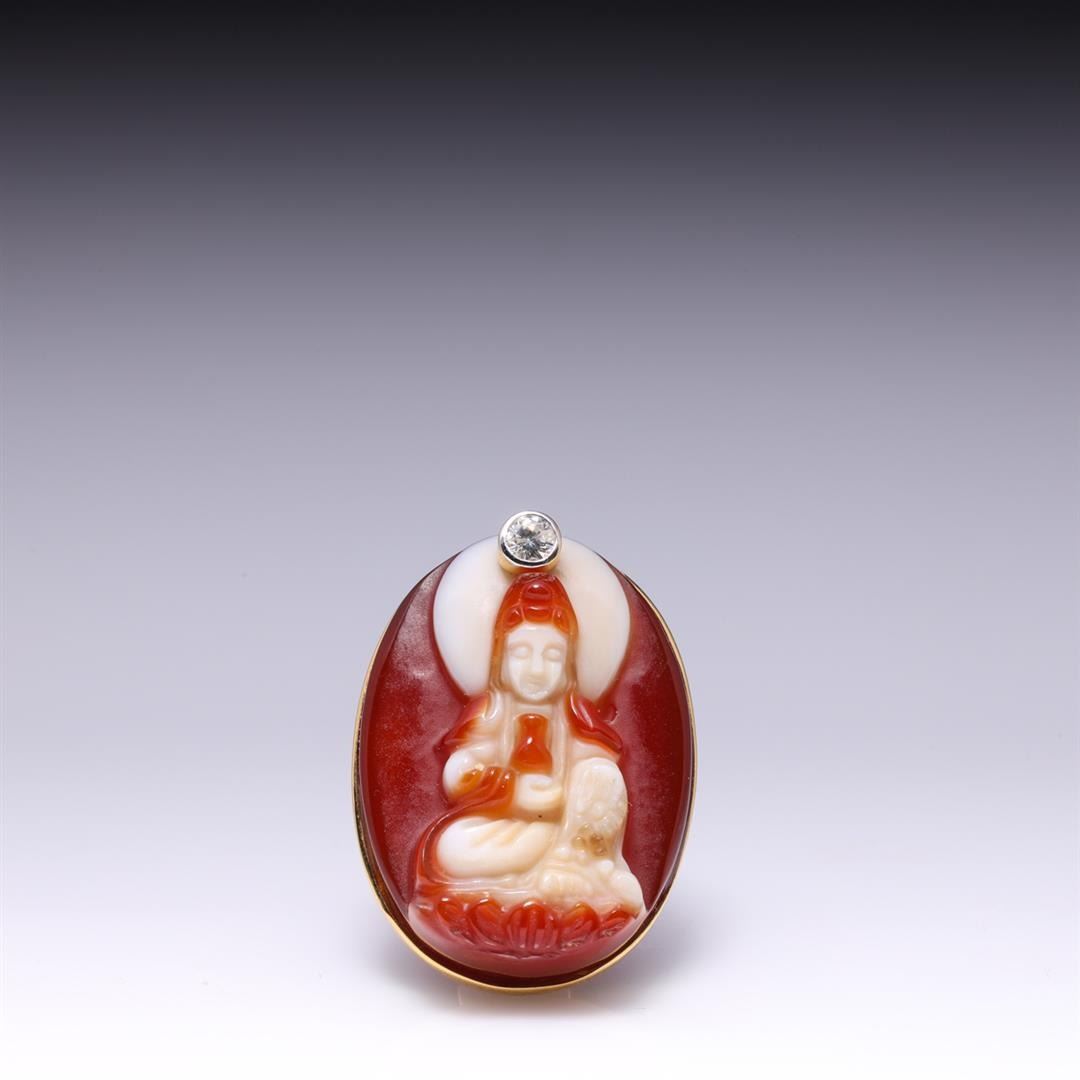 Pair of 18k yellow gold earrings designed by Carlo Rici; each earring set with finely carved carnelian and white agate depictions of Guanyin in high relief, each agate topped with single bezel set round diamond, each marked 750 RICI; gross weight 20.5 g,