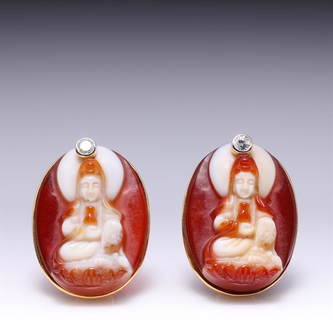 Pair of 18k yellow gold earrings designed by Carlo Rici; each earring set with finely carved carnelian and white agate depictions of Guanyin in high relief, each agate topped with single bezel set round diamond, each marked 750 RICI; gross weight 20.5 g,