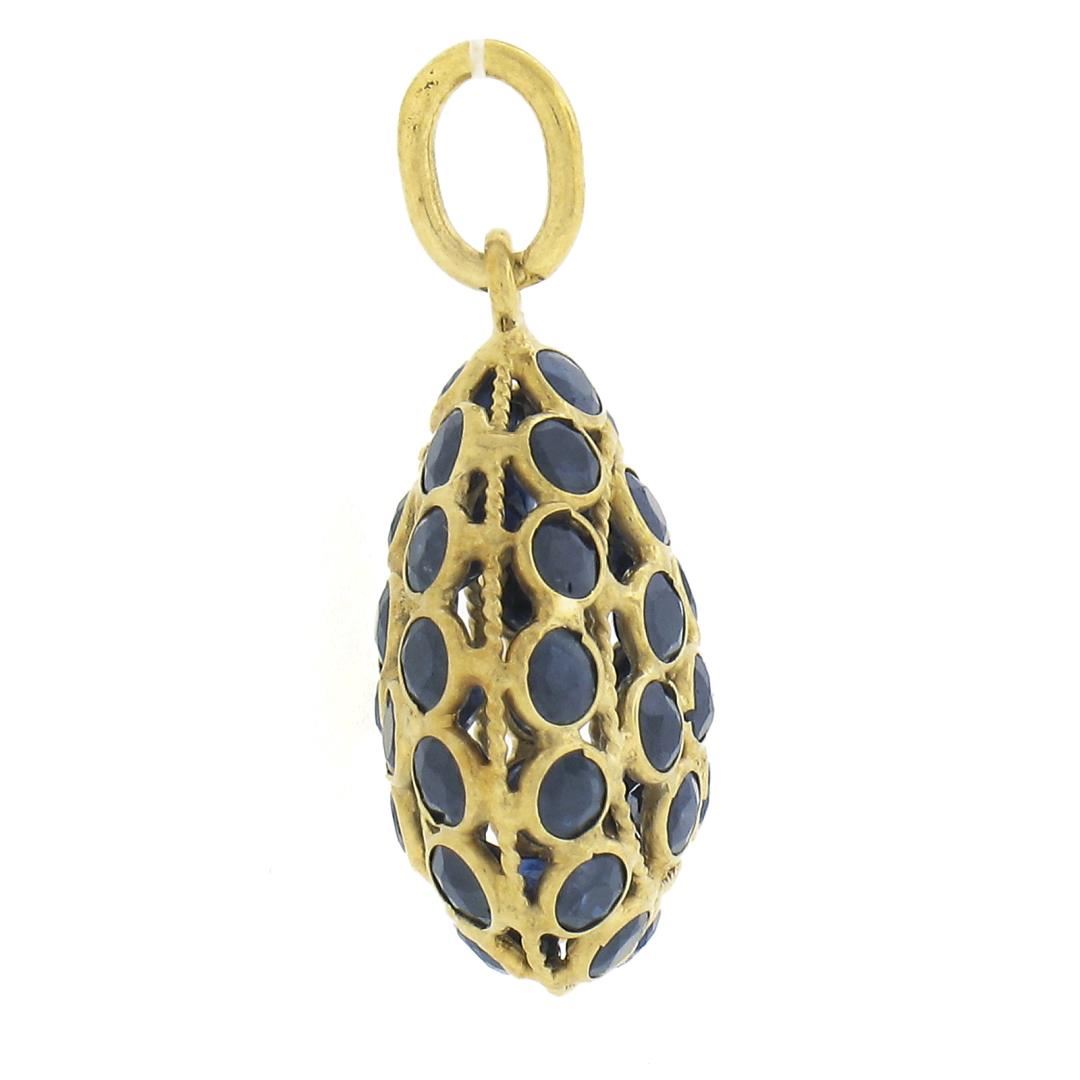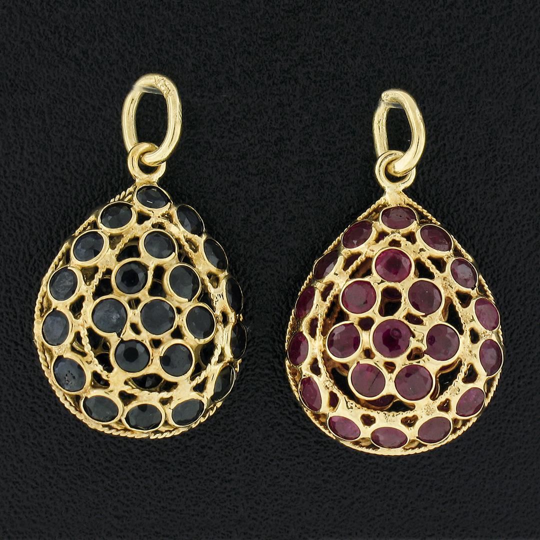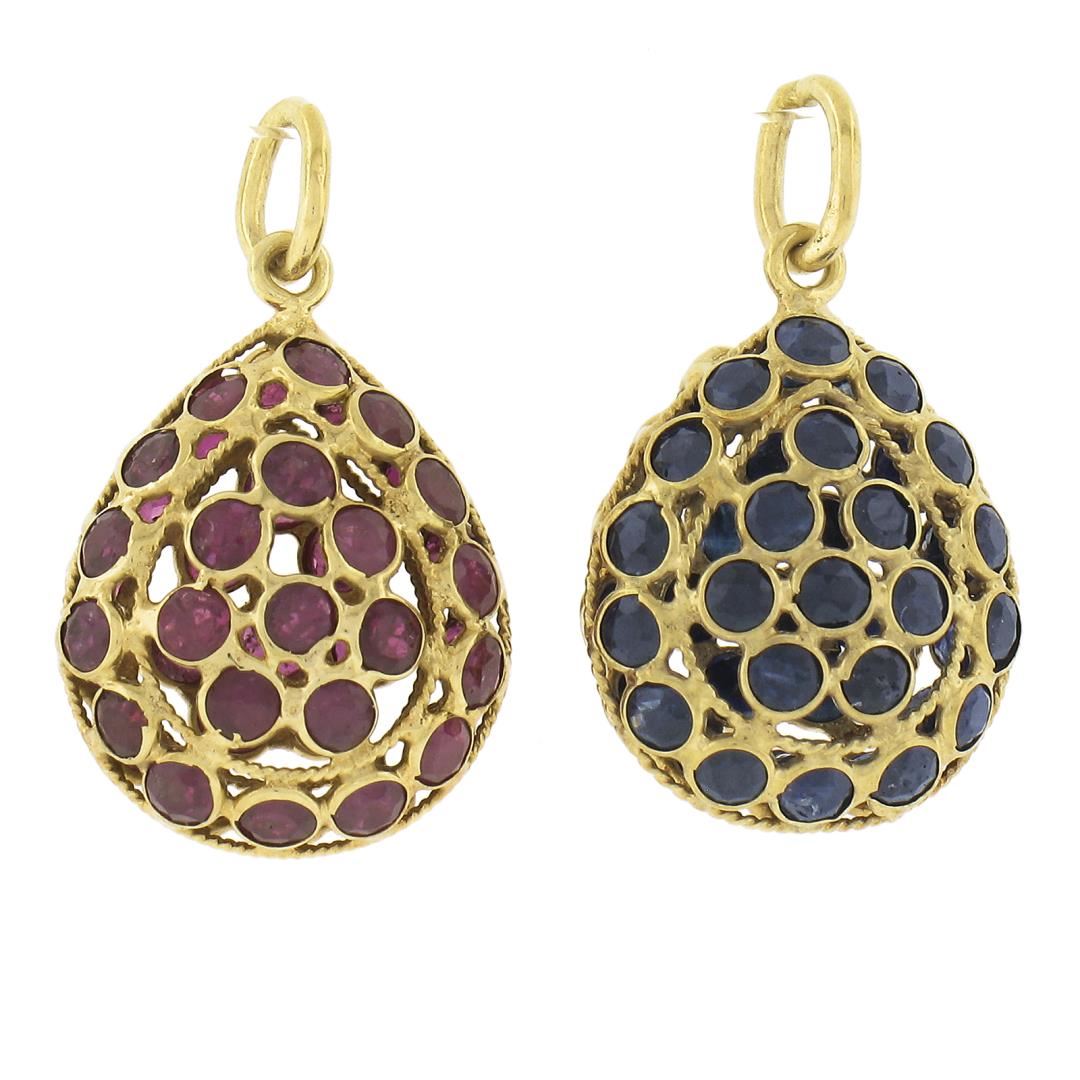 A solid 18k yellow gold pain of charms pendants, with numerous of round cut natural rubies & sapphires. The pendant weighs a total of 2.24 grams, measures 20.4x12.1mm including the bail, and the inside of the bail measures 2.6x2.2mm.