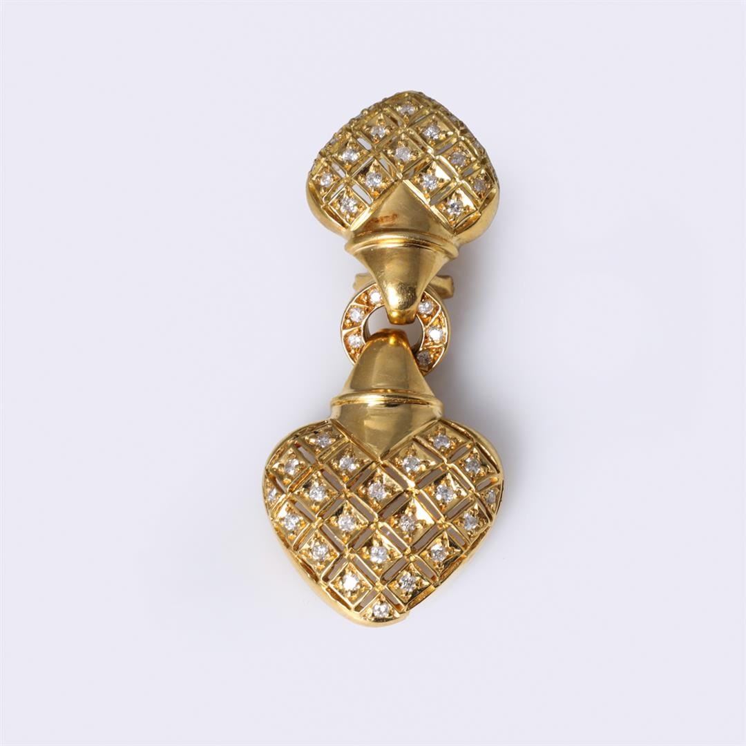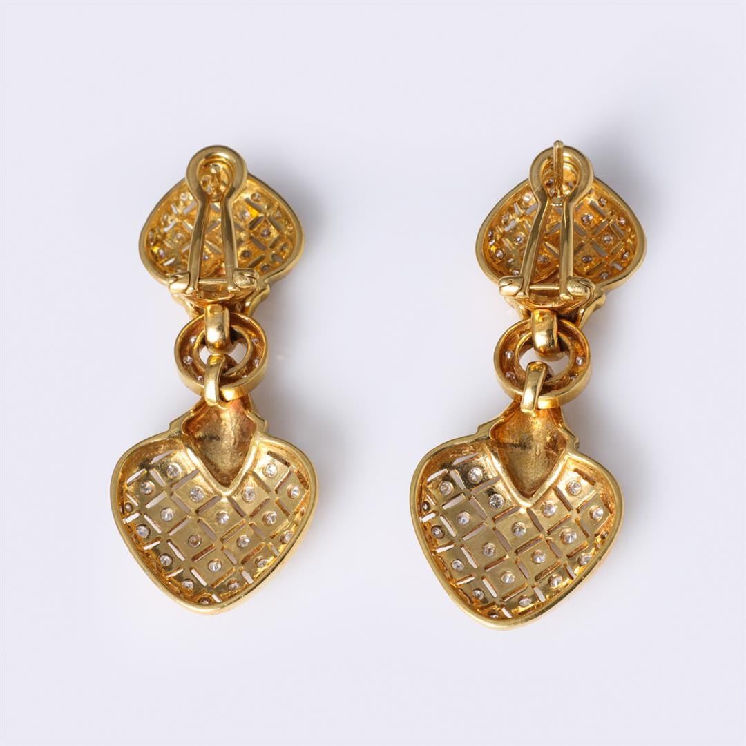 Pair 18k Yellow Gold & Diamond Double Heart Earrings containing one hundred and two round brilliant cut diamonds weighing approximately 1.20 cts. Total weight of 20 gm. Estimated retail value $6,800.