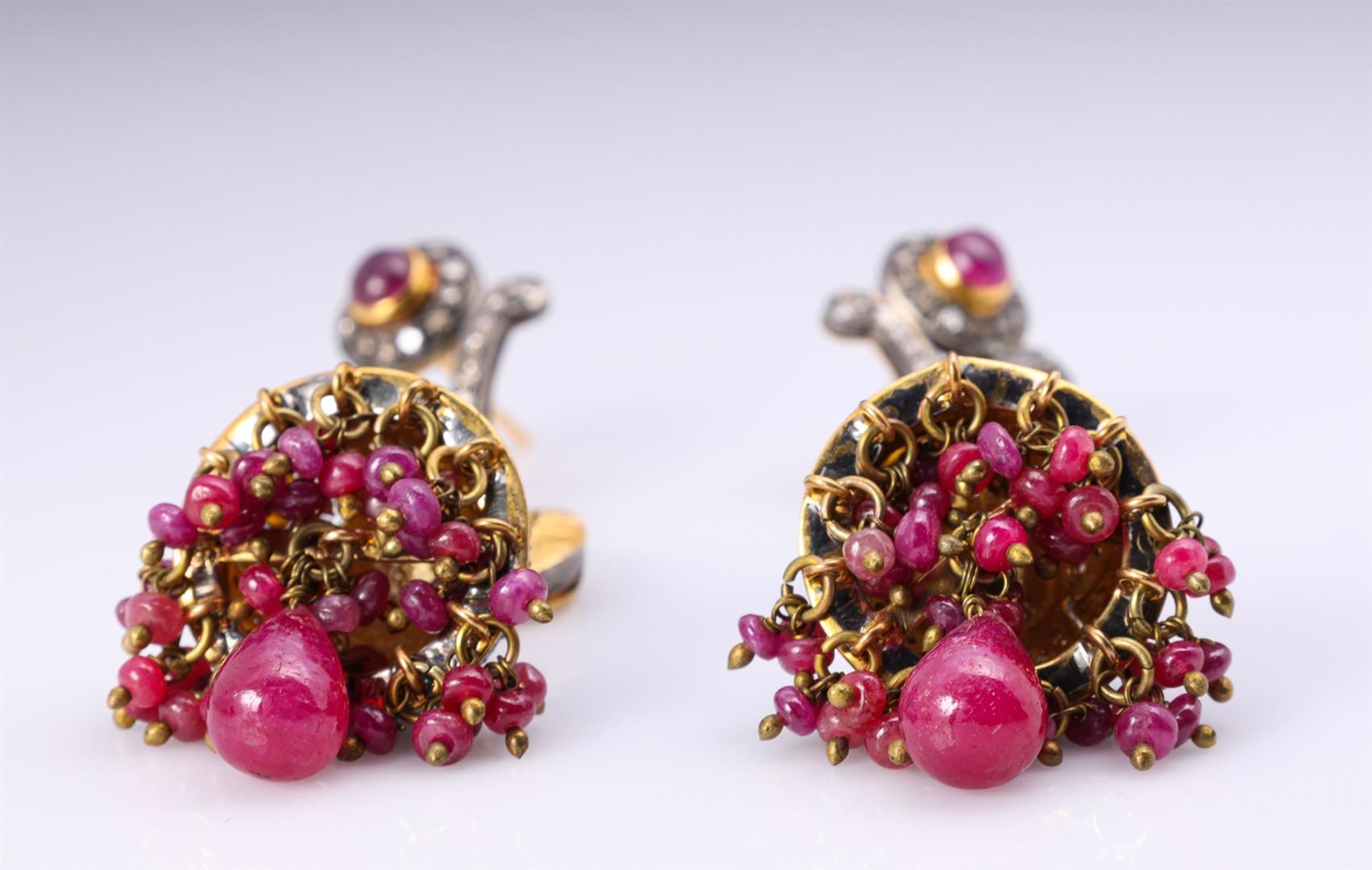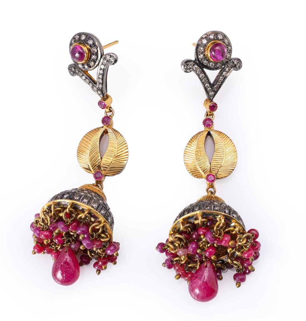 Pair of antique Indian gold topped silver ruby and diamond chandelier earrings; missing earring backs, gross weight 36.5 g., each earring L 3 1/8" (approx.)