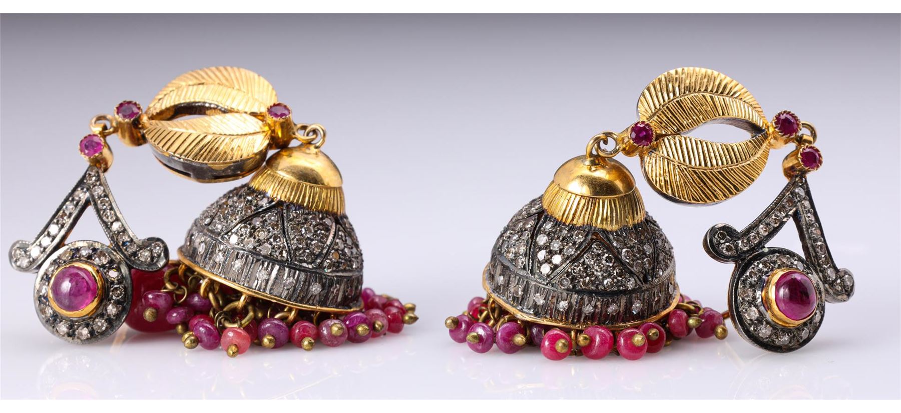 Pair of antique Indian gold topped silver ruby and diamond chandelier earrings; missing earring backs, gross weight 36.5 g., each earring L 3 1/8" (approx.)