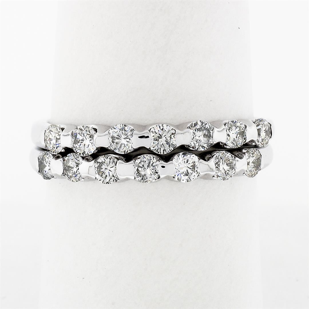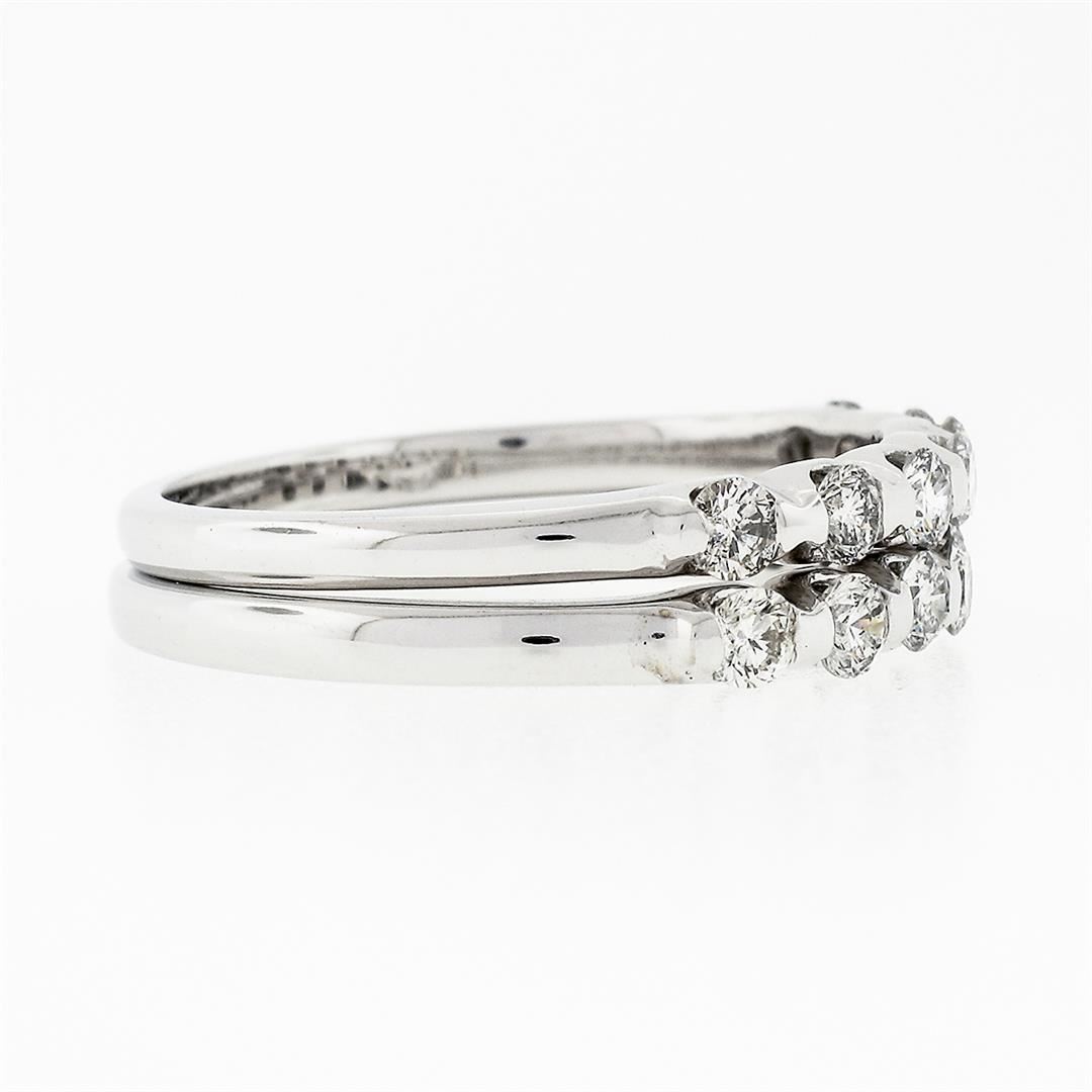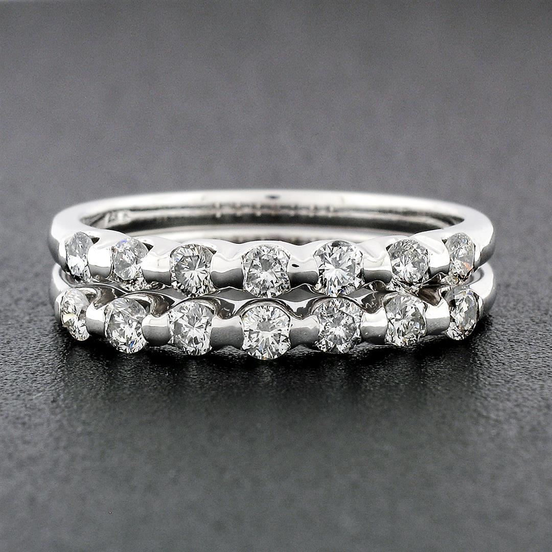 A pair of solid 14k white gold stack band rings, with 14 round brilliant cut natural diamonds (G/H - SI1/SI2 ; 1.00ctw). The ring is size 9.0, weighs a total of 5.03 grams, and measures 5.38mm wide together .