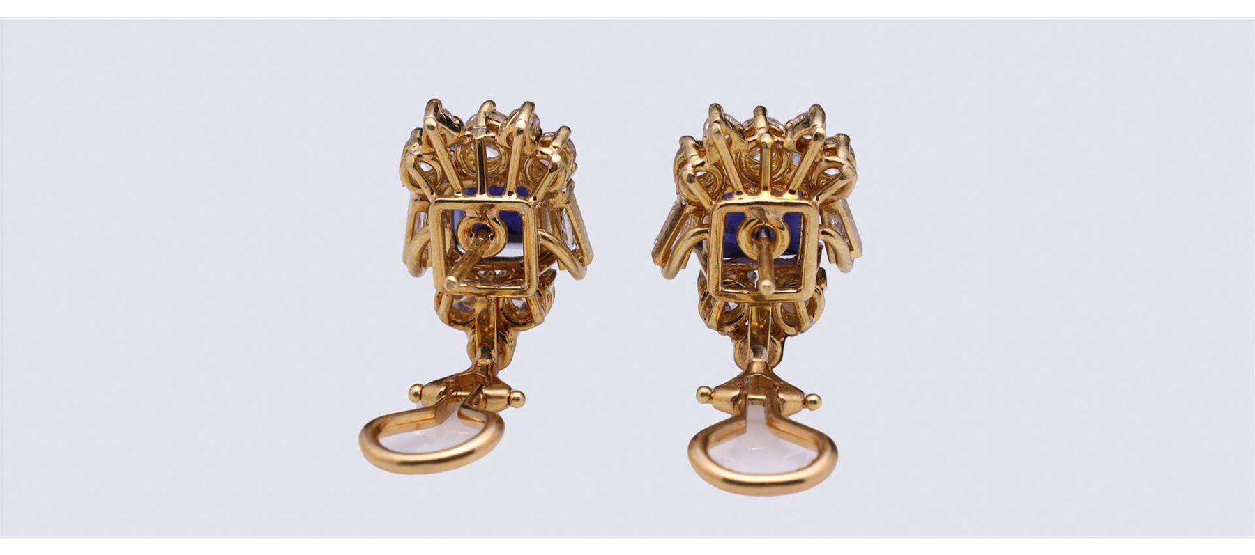 Pair of 18K Yellow Gold Iolite & Diamond Earrings containing two square cut iolite weighing approximately 0.20 cts. Twenty diamonds weighing approximately 1.50 cts. Total weight is 8.6 gm. Estimated retail value $3,900.