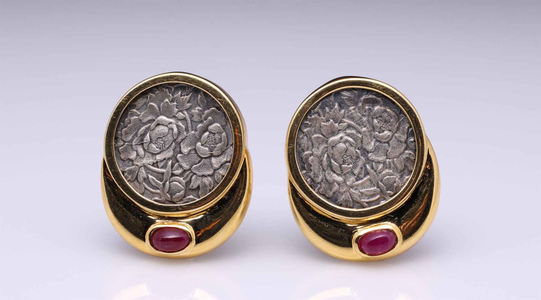 Pair of 18k yellow gold earrings; each set with sterling silver floral medallions with single ruby cabochon, designed by R.L. Kay, each marked 18k 750; the silver medallions slightly loose in the mounting, gross weight 20.8 g, each 1" x 3/4" (approx.)